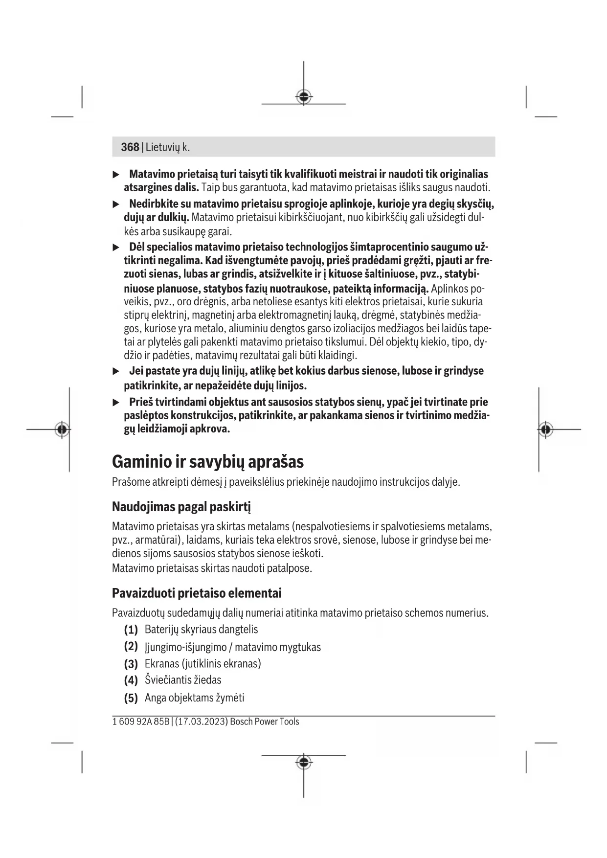 Baterijos 4×1,5V LR03(AAA) Veikimo laikas apie. 4h Bosch Power Tools 1 609 92A 85B | (17.03.2023)370 | Lietuvių k. Skaitmeninis universalusis ieškiklis UniversalDetect Svoris pagal „EPTA‑Procedure01:2014“ 0,34kg Matmenys (ilgis×plotis×aukštis) 255×90×56mm A) priklausomai nuo veikimo režimo, objekto medžiagos ir dydžio bei pagrindo medžiagos ir bū- senos B) Jei laide nėra įtampos, prietaisas randa tik mažesniame gylyje esančius laidus C) Atitinka dvi gipso kartono plokštes D) Atsiranda tik nelaidžių nešvarumų, tačiau galima tikėtis aprasojimo sukelto laikino laidumo. Firminėje lentelėje esantis serijos numeris (7) yra skirtas jūsų matavimo prietaisui vienareikšmiškai identifikuoti. u Esant nepalankioms pagrindo savybėms, matavimo rezultatas randamų objektų gylio ir tikslumo atžvilgiu gali būti blogesnis. Montavimas Baterijų įdėjimas/keitimas Matavimo prietaisą patariama naudoti su šarminėmis mangano baterijomis. Nenaudokite baterijų su aukštesne kaip 1,5V vardine įtampa. Norėdami atidaryti baterijų skyriaus dangtelį(1), stumkite jį nuo baterijų skyriaus rodyk- lės kryptimi. Įdėkite baterijas. Įdėdami baterijas atkreipkite dėmesį į baterijų skyriaus viduje nurodytus baterijų polius. Ekrano būsenos eilutėje esantis baterijų indikatorius(f) rodo esamą baterijų būseną. Jei ekrano būsenos eilutėje atsiranda šalia pateiktas rodmuo, matavimo prie- taisą bus galima naudoti ne ilgiau kaip 15min. Pakeiskite baterijas. Visada kartu pakeiskite visas baterijas. Naudokite tik vieno gamintojo ir vienodos talpos baterijas. u Jei matavimo prietaiso ilgesnį laiką nenaudosite, išimkite iš jo baterijas. Ilgesnį laiką laikant baterijas matavimo prietaise, dėl korozijos jos gali pradėti irti ir savaime išsikrauti. Naudojimas u Saugokite matavimo prietaisą nuo drėgmės ir tiesioginio saulės spindulių po- veikio. u Matavimo prietaisą saugokite nuo itin aukštos ir žemos temperatūros bei tem- peratūros svyravimų. Esant didesniems temperatūros svyravimams, prieš prie- 1 609 92A 85B | (17.03.2023) Bosch Power ToolsLietuvių k. | 371 taisą įjungdami, palaukite, kol stabilizuosis jo temperatūra. Esant ypač aukštai ar žemai temperatūrai arba temperatūros svyravimams, gali būti pakenkiama matavimo prietaiso tikslumui ir ekrano rodmenims. u Saugokite, kad matavimo prietaisas nebūtų smarkiai sutrenktas ir nenukristų. Po stipraus išorinio poveikio matavimo prietaisui arba pastebėję matavimo prietaiso veikimo pakitimų, dėl jo patikrinimo turite kreiptis į Bosch klientų aptarnavimo tarny- bą. u Kad nepadarytumėte įtakos matavimui, matavimo prietaisą laikykite tik už tam skirtų rankenų pavirčių(9). u Jutiklio veikimo zonoje (6) matavimo prietaiso užpakalinėje pusėje neužklijuo- kite jokių lipdukų ar lentelių. Ypač didelę įtaką matavimo rezultatams daro metali- nės lentelės. Matuodami nemūvėkite pirštinėmis ir užtikrinkite pakankamą įžeminimą. Esant nepakankamam įžeminimui, gali būti pakenkta laidų, kuriais teka elekt- ros srovė, atpažinimui. Nematuokite arti prietaisų, kurie sukuria stiprų elektrinį, magnetinį arba elektromagnetinį lauką, pvz., mobiliųjų telefonų, nešiojamųjų kompiute- rių arba planšečių. Jei yra galimybė, deaktyvinkite visų prietaisų, kurių spin- duliuotė gali pakenkti matavimui, atitinkamas funkcijas arba tuos prietaisus iš- junkite. Jutiklinio ekrano naudojimas u Nenaudokite matavimo prietaiso, jei yra jutiklinio ekrano pažeidimų (pvz., pavir- šiaus įtrūkių ir pan.). Ekranas yra padalytas į būsenos eilutę(c) bei jutiklinį ekraną su informacine sritimi(b) ir navigacine sritimi(a). Būsenos eilutė(c) rodo esamąjį garsinio signalo(e) nustatymą, baterijos indikatorių(f) bei puslapio numerį(d) (esant daugiapuslapiniam meniu). Matavimo prietaisą jutikliniu ekranu galima valdyti liečiant ekraną. u Jutiklinį ekraną valdykite tik pirštais. u Jutiklinį ekraną saugokite nuo kontakto su kitais elektriniais prietaisais ir vandeniu. u Norėdami nuvalyti jutiklinį ekraną, matavimo prietaisą išjunkite.Nešvarumus nuvaly- kite, pvz., mikropluošto šluoste. Judėjimas per meniu punktus Kad matavimo prietaisą būtų galima valdyti jutikliniu ekranu, atsiranda (šalia mygtukų ati- tinkama kalba) šie bendrojo pobūdžio mygtukai: Bosch Power Tools 1 609 92A 85B | (17.03.2023)372 | Lietuvių k. Mygtukas Veiksmas Atversti ankstesnį puslapį Atversti tolesnį puslapį Grįžti/eiti aukštyn vienu meniu lygmeniu Meniu<Nuostatai> iškvietimas Meniu<Pagalbinis meniu> iškvietimas Paruošimas naudoti Įjungimas ir išjungimas u Prieš įjungdami prietaisą įsitikinkite, kad jutiklio zona (6) nėra drėgna. Jei reikia, sausai nušluostykite matavimo prietaisą šluoste. u Jei prietaiso aplinkos temperatūra gerokai pasikeitė, prieš įjungdami prietaisą leiskite susivienodinti prietaiso ir aplinkos temperatūrai. Norėdami matavimo prietaisą įjungti, paspauskite įjungimo-išjungimo mygtuką(2). Lai- kykitės matavimo prietaiso naudojimo patarimų. Pomeniu<Nuorodos> galite deaktyvin- ti žemiau pateiktų įjungimo operacijų išsamius nurodymus. Norėdami matavimo prietaisą išjungti, paspauskite įjungimo-išjungimo mygtuką(2). Jei apie5min neatliekamas joks matavimas ir nepaspaudžiamas joks matavimo prietaiso mygtukas ar klavišas, kad būtų tausojamos baterijos, matavimo prietaisas automatiškai išsijungia. Veikimo principas (žr.Apav.) Matavimo prietaisu tikrinamas pagrindas jutiklio veikimo zonoje(6) matavimo kryptimi z iki maksimalaus aptikimo gylio. Pasirinkite pageidaujamą veikimo režimą. Matavimo prietaisą šiek tiek spausdami veskite per pagrindą visada tiesiai x ašies krypti- mi, jo nepakeldami ir nekeisdami prispaudimo jėgos. Kad matavimas būtų teisingas, sieninis jutiklis(8) su pagrindu turi turėti nekintamą kontaktą. Matavimo prietaisą visada tvirtai laikykite už rankenos(9) ir matavimo metu 