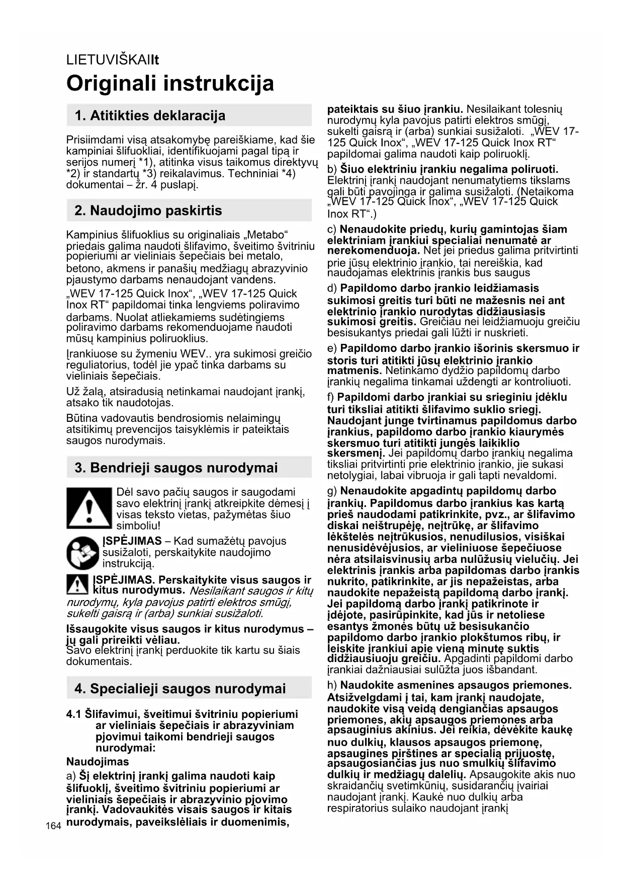 Originali instrukcija Prisiimdami visą atsakomybę pareiškiame, kad šie kampiniai šlifuokliai, identifikuojami pagal tipą ir serijos numerį *1), atitinka visus taikomus direktyvų *2) ir standartų *3) reikalavimus. Techniniai *4) dokumentai – žr. 4 puslapį. Kampinius šlifuoklius su originaliais „Metabo“ priedais galima naudoti šlifavimo, šveitimo švitriniu popieriumi ar vieliniais šepečiais bei metalo, betono, akmens ir panašių medžiagų abrazyvinio pjaustymo darbams nenaudojant vandens. „WEV 17-125 Quick Inox“, „WEV 17-125 Quick Inox RT“ papildomai tinka lengviems poliravimo darbams. Nuolat atliekamiems sudėtingiems poliravimo darbams rekomenduojame naudoti mūsų kampinius poliruoklius. Įrankiuose su žymeniu WEV.. yra sukimosi greičio reguliatorius, todėl jie ypač tinka darbams su vieliniais šepečiais. Už žalą, atsiradusią netinkamai naudojant įrankį, atsako tik naudotojas. Būtina vadovautis bendrosiomis nelaimingų atsitikimų prevencijos taisyklėmis ir pateiktais saugos nurodymais. Dėl savo pačių saugos ir saugodami savo elektrinį įrankį atkreipkite dėmesį į visas teksto vietas, pažymėtas šiuo simboliu! ĮSPĖJIMAS – Kad sumažėtų pavojus susižaloti, perskaitykite naudojimo instrukciją. ĮSPĖJIMAS. Perskaitykite visus saugos ir kitus nurodymus. Nesilaikant saugos ir kitų nurodymų, kyla pavojus patirti elektros smūgį, sukelti gaisrą ir (arba) sunkiai susižaloti. Išsaugokite visus saugos ir kitus nurodymus – jų gali prireikti vėliau. Savo elektrinį įrankį perduokite tik kartu su šiais dokumentais.