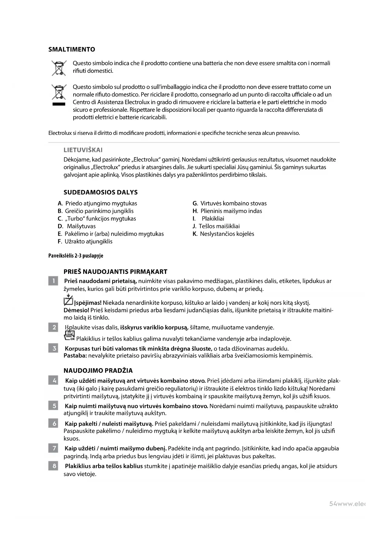 IŠMETIMAS Šis ant gaminio esantis simbolis rodo, kad šiame gaminyje yra akumuliatorius, kurio negalima šalinti su įprastomis buitinėmis atliekomis. Šis simbolis ant gaminio ar jo pakuotės rodo, kad gaminio negalima laikyti buitinėmis atliekomis. Norėdami perdirbti savo gaminį, nuneškite jį į ocialų surinkimo punktą arba „Electrolux“ techninės priežiūros centrą, kur bus galima saugiai ir profesionaliai išimti ir perdirbti akumuliatorių ir elektrines dalis. Laikykitės savo šalies taisyklių dėl atskiro elektrinių gaminių ir įkraunamų akumuliatorių surinkimo. „Electrolux“ pasilieka teisę nepranešusi keisti gaminius, informaciją ir techninius duomenis. LATVIEŠU Paldies, ka izvēlējāties Electrolux izstrādājumu. Labākam sniegumam izvēlieties oriģinālos Electrolux piederumus un rezerves daļas. Tie ir paredzēti tieši jūsu izstrādājumam. Šis izstrādājums veidots, domājot par apkārtējo vidi. Visas plastmasas daļas ir paredzētas pārstrādei.
