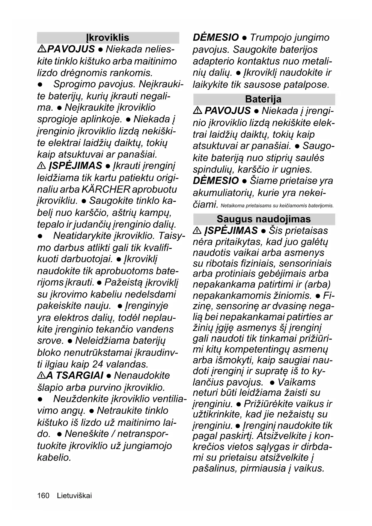 - ES atitikties deklaracija /LHWXYLģNDL Įkroviklis PAVOJUS ● Niekada nelies- kite tinklo kištuko arba maitinimo lizdo drėgnomis rankomis. ● Sprogimo pavojus. Neįkrauki- te baterijų, kurių įkrauti negali- ma. ● Neįkraukite įkroviklio sprogioje aplinkoje. ● Niekada į įrenginio įkroviklio lizdą nekiški- te elektrai laidžių daiktų, tokių kaip atsuktuvai ar panašiai. 몇 ĮSPĖJIMAS ● Įkrauti įrenginį leidžiama tik kartu patiektu origi- naliu arba KÄRCHER aprobuotu įkrovikliu. ● Saugokite tinklo ka- belį nuo karščio, aštrių kampų, tepalo ir judančių įrenginio dalių. ● Neatidarykite įkroviklio. Taisy- mo darbus atlikti gali tik kvalifi- kuoti darbuotojai. ● Įkroviklį naudokite tik aprobuotoms bate- rijoms įkrauti. ● Pažeistą įkroviklį su įkrovimo kabeliu nedelsdami pakeiskite nauju. ● Įrenginyje yra elektros dalių, todėl neplau- kite įrenginio tekančio vandens srove. ● Neleidžiama baterijų bloko nenutrūkstamai įkraudinv- ti ilgiau kaip 24 valandas. 몇 A TSARGIAI ● Nenaudokite šlapio arba purvino įkroviklio. ● Neuždenkite įkroviklio ventilia- vimo angų. ● Netraukite tinklo kištuko iš lizdo už maitinimo lai- do. ● Neneškite / netranspor- tuokite įkroviklio už jungiamojo kabelio. DĖMESIO ● Trumpojo jungimo pavojus. Saugokite baterijos adapterio kontaktus nuo metali- nių dalių. ● Įkroviklį naudokite ir laikykite tik sausose patalpose. Baterija PAVOJUS ● Niekada į įrengi- nio įkroviklio lizdą nekiškite elek- trai laidžių daiktų, tokių kaip atsuktuvai ar panašiai. ● Saugo- kite bateriją nuo stiprių saulės spindulių, karščio ir ugnies. DĖMESIO ● Šiame prietaise yra akumuliatorių, kurie yra nekei- čiami. Netaikoma prietaisams su keičiamomis baterijomis. Saugus naudojimas 몇 ĮSPĖJIMAS ● Šis prietaisas nėra pritaikytas, kad juo galėtų naudotis vaikai arba asmenys su ribotais fiziniais, sensoriniais arba protiniais gebėjimais arba nepakankama patirtimi ir (arba) nepakankamomis žiniomis. ● Fi- zinę, sensorinę ar dvasinę nega- lią bei nepakankamai patirties ar žinių įgiję asmenys šį įrenginį gali naudoti tik tinkamai prižiūri- mi kitų kompetentingų asmenų arba išmokyti, kaip saugiai nau- doti įrenginį ir supratę iš to ky- lančius pavojus. ● Vaikams neturi būti leidžiama žaisti su įrenginiu. ● Prižiūrėkite vaikus ir užtikrinkite, kad jie nežaistų su įrenginiu. ● Įrenginį naudokite tik pagal paskirtį. Atsižvelkite į kon- krečios vietos sąlygas ir dirbda- mi su prietaisu atsižvelkite į pašalinus, pirmiausia į vaikus./LHWXYLģNDL ● Pavojingoje aplinkoje (pvz., degalinėse) vykdykite atitinka- mus saugos nurodymus. Nieka- da nenaudokite įrenginio patalpose, kuriose gresia spro- gimo pavojus. ● Nepurkškite jo- kių objektų, kurių sudėtyje yra sveikatai pavojingų medžiagų (pvz., asbesto). ● Sužalojimų ri- zika. Nenukreipkite skysčio sro- vės į akis. 몇 ATSARGIAI ● Nenaudokite įrenginio, jei jis prieš tai buvo nu- kritęs, yra pastebimai pažeistas arba nesandarus. ● Aparatą eksploatuokite ar sandėliuokite pagal atitinkamą aprašymą ar paveikslą. ● Jokiu būdu nepali- kite veikiančio prietaiso be prie- žiūros. ● Kad aparatas būtų stovus, statykite jį tik ant tvirto, lygaus paviršiaus. ● Prietaisui apvirtus kyla pavojus susižeisti arba sugadinti prietaisą. Prieš imdamiesi bet kokios veiklos su prietaisu ar jo tvarkymo veiksmų turite užtikrinti stovumą. DĖMESIO ● Nepilkite jokių valy- mo priemonių ar kitų priedų. ● Aparato pažeidimai. Į vandens talpyklą nepilkite tirpiklio, skys- čių, kurių sudėtyje yra tirpiklių ar neskiestos rūgšties (pvz., vali- klio, benzino, dažų skiediklio ar acetono). ● Įrenginio pažeidimai dėl sausos eigos. Prietaisą įjun- kite tik tada, kai vandens bake yra vandens. ● Neeksploatuoki- te prietaiso žemesnėje tempera- tūroje kaip 0 °C. Naudojimas laikantis nurodymų Žemo slėgio valymo įrenginį naudokite tik privačioms reikmėms. Žemo slėgio valymo įrenginys skirtas valyti mašinas, automobilius, įrankius, fasadus, terasas, sodo prietai- sus, naminius gyvūnus ir pan., žemo slėgio vandens srove, nenaudojant jokių valymo priemonių. Aplinkos apsauga Pakuotės medžiagos gali būti perdirbamos. Pa- kuotės atliekas sutvarkykite tausodami aplinką. Elektros ir elektroniniuose prietaisuose būna ver- tingų perdirbamų medžiagų ir dažnai tokių dalių, pvz., baterijų, akumuliatorių arba alyvos,su kurio- mis netinkamai elgiantis arba netinkamai jas pa- šalinus gali kilti pavojus žmonių sveikatai ir aplinkai. Tačiau norint tinkamai eksploatuoti įrenginį šios sudeda- mosios dalys būtinos. Šiuo simboliu pažymėtus įrengi- nius draudžiama šalinti su buitinėmis atliekomis. Valymo darbus, kurių metu susidaro alyvos turin- čios nuotekos, pvz., variklių valymas, automobilių dugno plovimas), atlikti galima tik tose valymo vietose, kuriose yra alyvos separatorius. Darbus su valymo priemonėmis atlikti galima tik ant vandeniui atsparių darbinių paviršių su jungtimi prie nešvaraus vandens kanalizacijos. Neleiskite, kad valy- mo priemonės patektų į vandens telkinius arba įsi- skverbtų į dirvožemį. Kai kuriose šalyse draudžiama imti vandenį iš vie- šųjų vandens telkinių. Nuorodos dėl sudėtinių medžiagų (REACH) Naujausią informaciją apie sudėtines medžiagas rasite: www.kaercher.de/REACH Priedai ir atsarginės dalys Naudokite tik originalius priedus ir originalas atsargines dalis – taip užtikrinsite, kad įrenginys veiktų patikimai ir be trikčių. Informaciją apie priedus ir atsargines dalis rasite svetai- nėje www.kaercher.com. Komplektacija Įrenginio tiekiamo komplekto sudėtis parodyta ant pa- kuotės. Išpakavę patikrinkite, ar yra visos įrenginio de- talės. Jei trūksta priedų arba yra transportavimo pažeidimų, praneškite apie tai pardavėjui. Saugos įtais