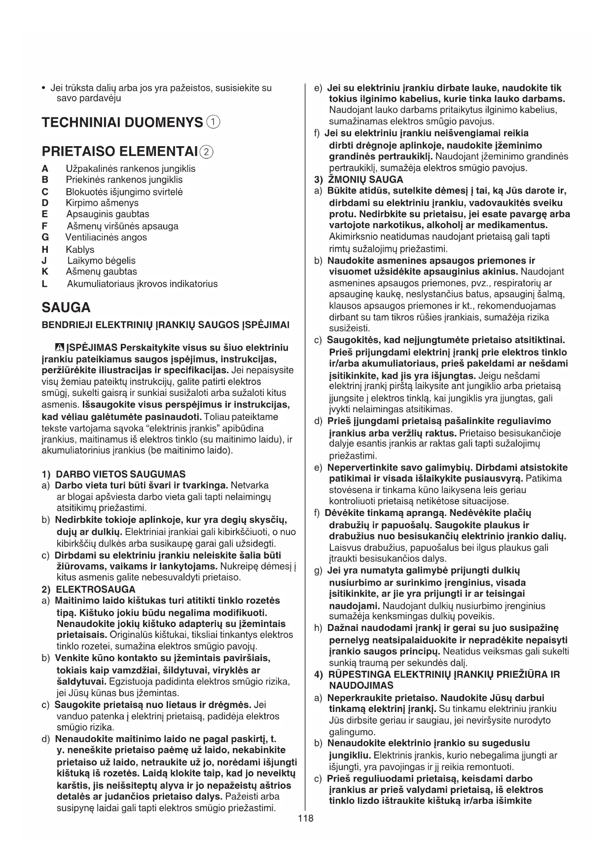 a) Būkite atidūs, sutelkite dėmesį į tai, ką Jūs darote ir, dirbdami su elektriniu įrankiu, vadovaukitės sveiku protu. Nedirbkite su prietaisu, jei esate pavargę arba vartojote narkotikus, alkoholį ar medikamentus. Akimirksnio neatidumas naudojant prietaisą gali tapti rimtų sužalojimų priežastimi. b) Naudokite asmenines apsaugos priemones ir visuomet užsidėkite apsauginius akinius. Naudojant asmenines apsaugos priemones, pvz., respiratorių ar apsauginę kaukę, neslystančius batus, apsauginį šalmą, klausos apsaugos priemones ir kt., rekomenduojamas dirbant su tam tikros rūšies įrankiais, sumažėja rizika susižeisti. c) Saugokitės, kad neįjungtumėte prietaiso atsitiktinai. Prieš prijungdami elektrinį įrankį prie elektros tinklo ir/arba akumuliatoriaus, prieš pakeldami ar nešdami įsitikinkite, kad jis yra išjungtas. Jeigu nešdami elektrinį įrankį pirštą laikysite ant jungiklio arba prietaisą įjungsite į elektros tinklą, kai jungiklis yra įjungtas, gali įvykti nelaimingas atsitikimas. d) Prieš įjungdami prietaisą pašalinkite reguliavimo įrankius arba veržlių raktus. Prietaiso besisukančioje dalyje esantis įrankis ar raktas gali tapti sužalojimų priežastimi. e) Nepervertinkite savo galimybių. Dirbdami atsistokite patikimai ir visada išlaikykite pusiausvyrą. Patikima stovėsena ir tinkama kūno laikysena leis geriau kontroliuoti prietaisą netikėtose situacijose. f) Dėvėkite tinkamą aprangą. Nedėvėkite plačių drabužių ir papuošalų. Saugokite plaukus ir drabužius nuo besisukančių elektrinio įrankio dalių. Laisvus drabužius, papuošalus bei ilgus plaukus gali įtraukti besisukančios dalys. g) Jei yra numatyta galimybė prijungti dulkių nusiurbimo ar surinkimo įrenginius, visada įsitikinkite, ar jie yra prijungti ir ar teisingai naudojami. Naudojant dulkių nusiurbimo įrenginius sumažėja kenksmingas dulkių poveikis. h) Dažnai naudodami įrankį ir gerai su juo susipažinę pernelyg neatsipalaiduokite ir nepradėkite nepaisyti įrankio saugos principų. Neatidus veiksmas gali sukelti sunkią traumą per sekundės dalį.