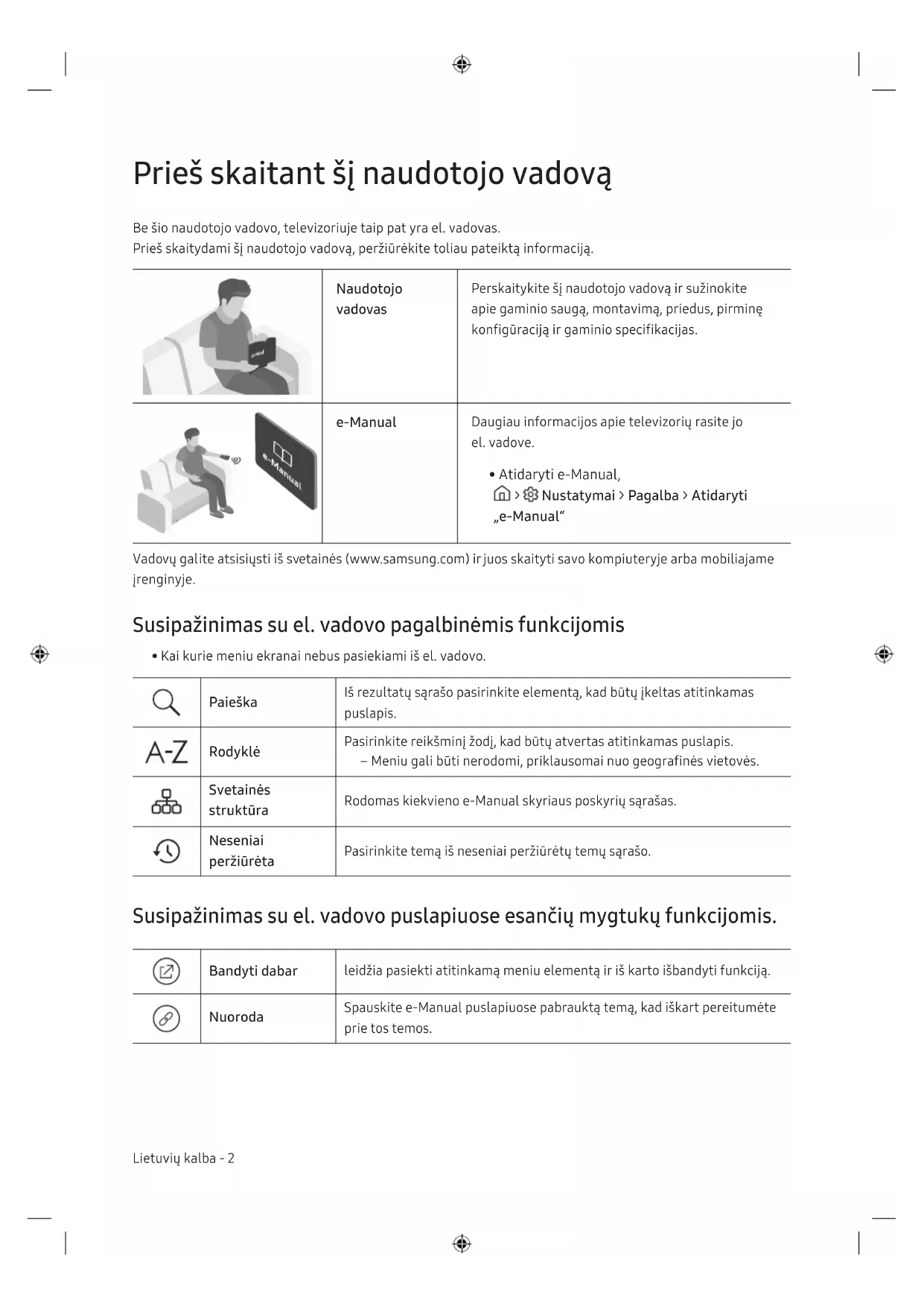 - Atidaryti e-Manual, > Nustatymai > Pagalba > Atidaryti „e-Manual“ Vadovų galite atsisiųsti iš svetainės (www.samsung.com) ir juos skaityti savo kompiuteryje arba mobiliajame įrenginyje. Susipažinimas su el.vadovo pagalbinėmis funkcijomis