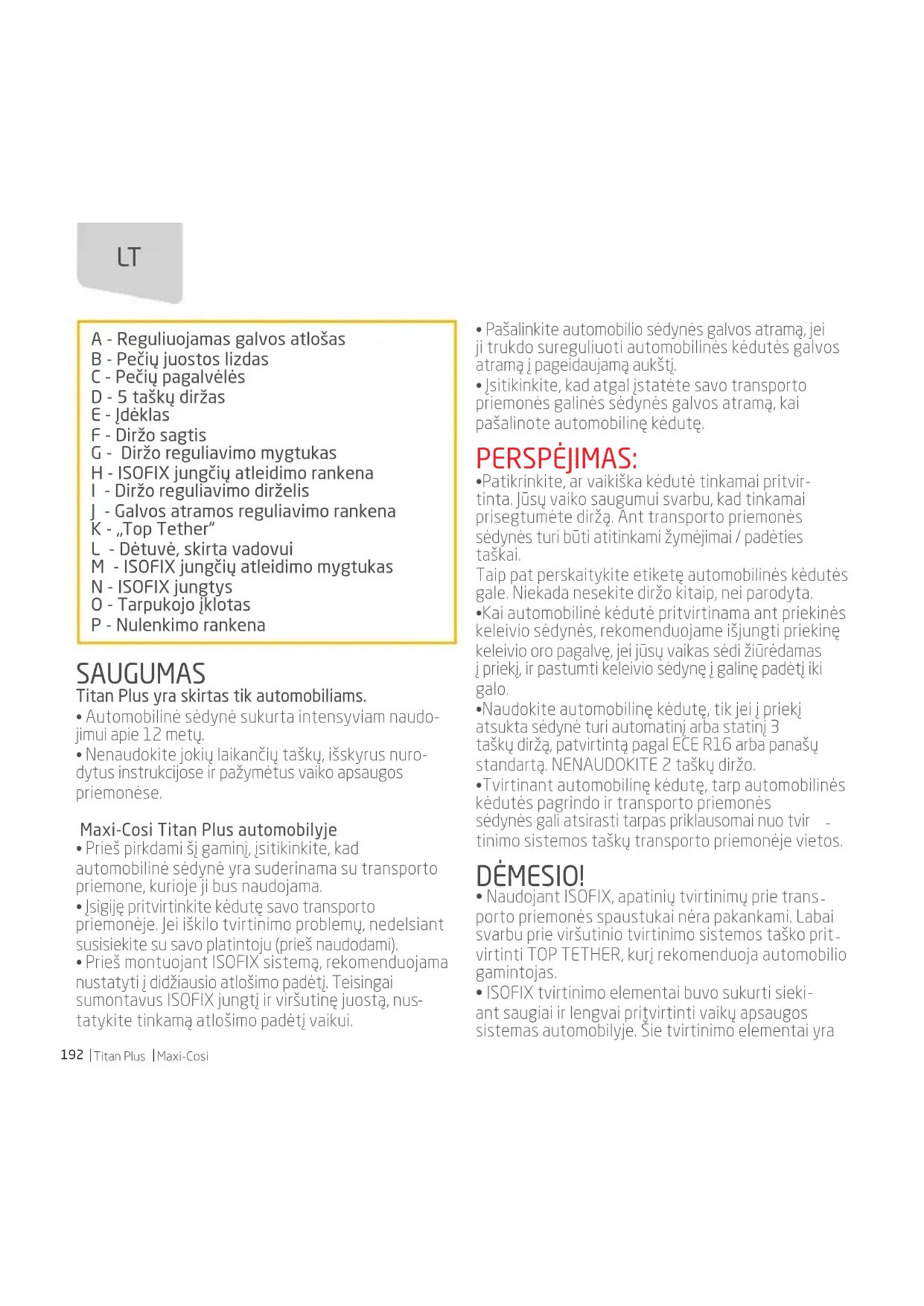 ant saugiai ir lengvai pritvirtinti vaikų apsaugos sistemas automobilyje. Šie tvirtinimo elementai yra A - Reguliuojamas galvos atlošas B - Pečių juostos lizdas C - Pečių pagalvėlės D - 5 taškų diržas E - Įdėklas F - Diržo sagtis G - Diržo reguliavimo mygtukas H - ISOFIX jungčių atleidimo rankena I - Diržo reguliavimo dirželis J - Galvos atramos reguliavimo rankena K - „Top Tether“ L - Dėtuvė, skirta vadovui M - ISOFIX jungčių atleidimo mygtukas N - ISOFIX jungtys O - Tarpukojo įklotas P - Nulenkimo rankena LTMaxi-Cosi