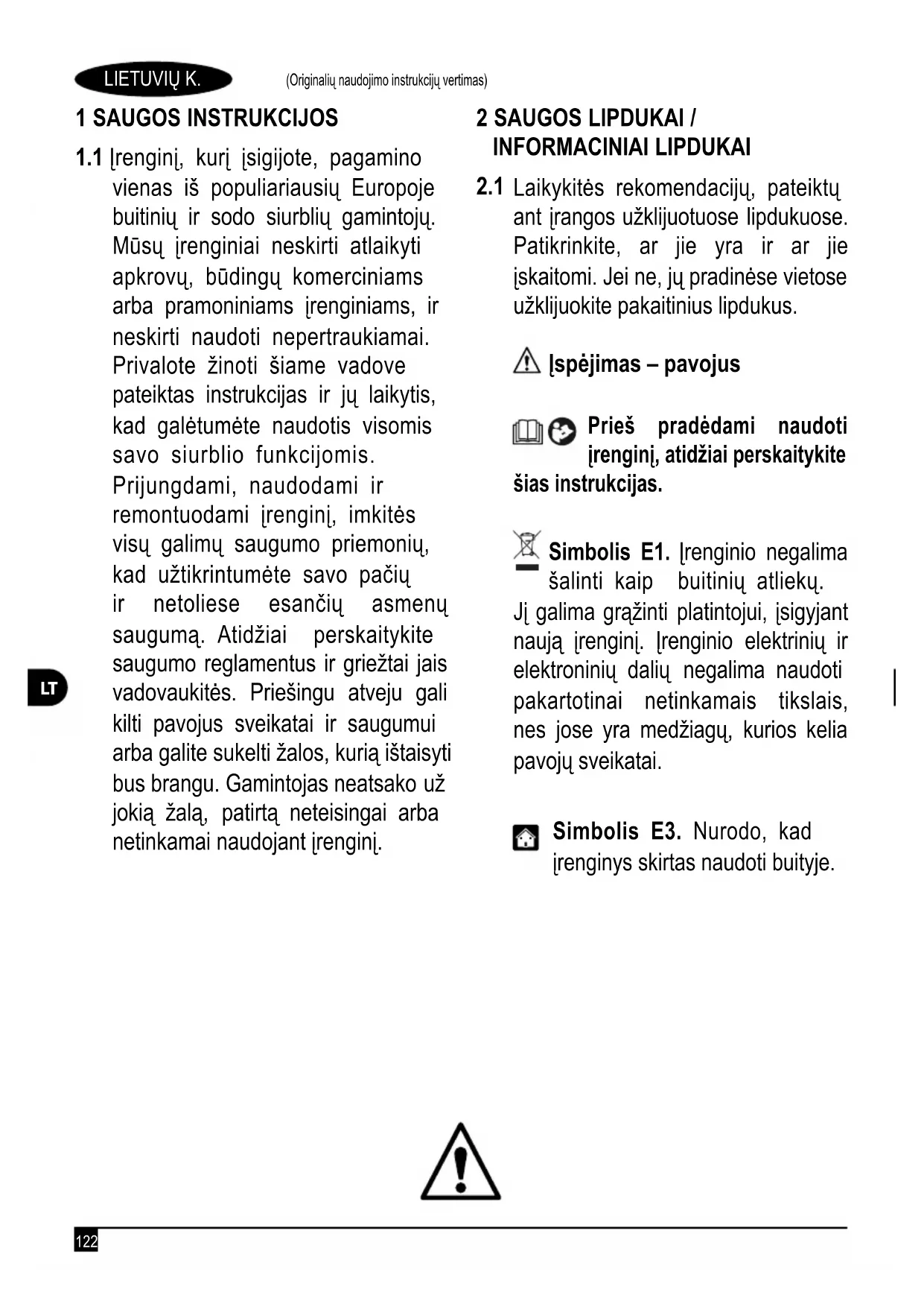 Laikykitės rekomendacijų, pateiktų ant įrangos užklijuotuose lipdukuose. Patikrinkite, ar jie yra ir ar jie įskaitomi. Jei ne, jų pradinėse vietose užklijuokite pakaitinius lipdukus. Įspėjimas – pavojus Prieš pradėdami naudoti įrenginį, atidžiai perskaitykite šias instrukcijas. Simbolis E1. Įrenginio negalima šalinti kaip buitinių atliekų. Jį galima grąžinti platintojui, įsigyjant naują įrenginį. Įrenginio elektrinių ir elektroninių dalių negalima naudoti pakartotinai netinkamais tikslais, nes jose yra medžiagų, kurios kelia pavojų sveikatai. Simbolis E3. Nurodo, kad įrenginys skirtas naudoti buityje.123 LIETUVIŲ K. (Originalių naudojimo instrukcijų vertimas)