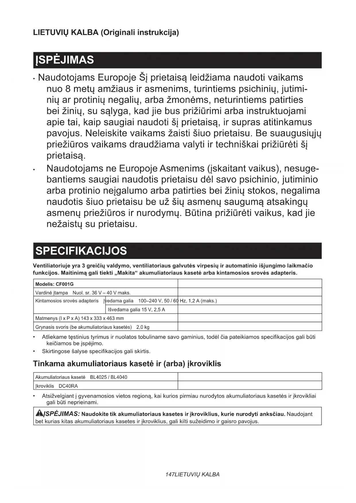 - NaudotojamsneEuropojeAsmenims(įskaitantvaikus),nesuge- bantiemssaugiainaudotisprietaisudėlsavopsichinio,jutiminio arbaprotinioneįgalumoarbapatirtiesbeižiniųstokos,negalima naudotisšiuoprietaisubeužšiųasmenųsaugumąatsakingų asmenųpriežiūrosirnurodymų.Būtinaprižiūrėtivaikus,kadjie nežaistųsuprietaisu. SPECIFIKACIJOS Ventiliatoriuje yra 3 greičių valdymo, ventiliatoriaus galvutės virpesių ir automatinio išjungimo laikmačio funkcijos. Maitinimą gali tiekti „Makita“ akumuliatoriaus kasetė arba kintamosios srovės adapteris. Modelis: CF001GVardinėįtampa Nuol. sr. 36 V – 40 V maks.Kintamosiossrovėsadapteris Įvedamagalia 100–240 V, 50 / 60 Hz, 1,2 A (maks.)Išvedama galia 15 V, 2,5 AMatmenys (I x P x A) 143 x 333 x 463 mmGrynasissvoris(beakumuliatoriauskasetės) 2,0 kg
