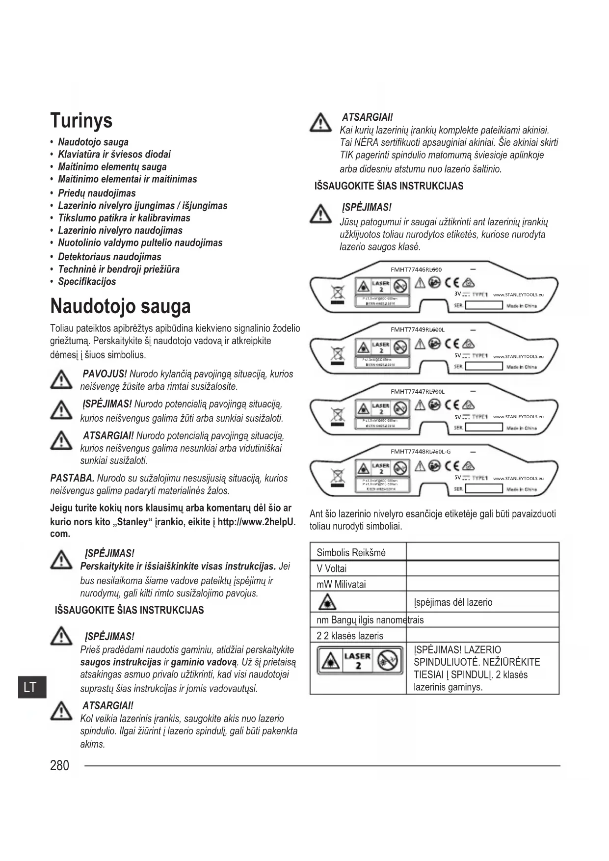 www.STANLEYTOOLS.euP ≤1.0mW@630-680nmP ≤1.0mW@510-530nm Ant šio lazerinio nivelyro esančioje etiketėje gali būti pavaizduoti toliau nurodyti simboliai. Simbolis Reikšmė V Voltai mW Milivatai Įspėjimas dėl lazerio nm Bangų ilgis nanometrais 2 2 klasės lazeris