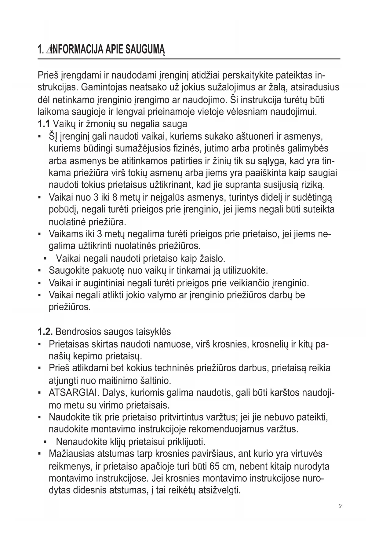 - Vaikai negali atlikti jokio valymo ar įrenginio priežiūros darbų be priežiūros. 1.2. Bendrosios saugos taisyklės