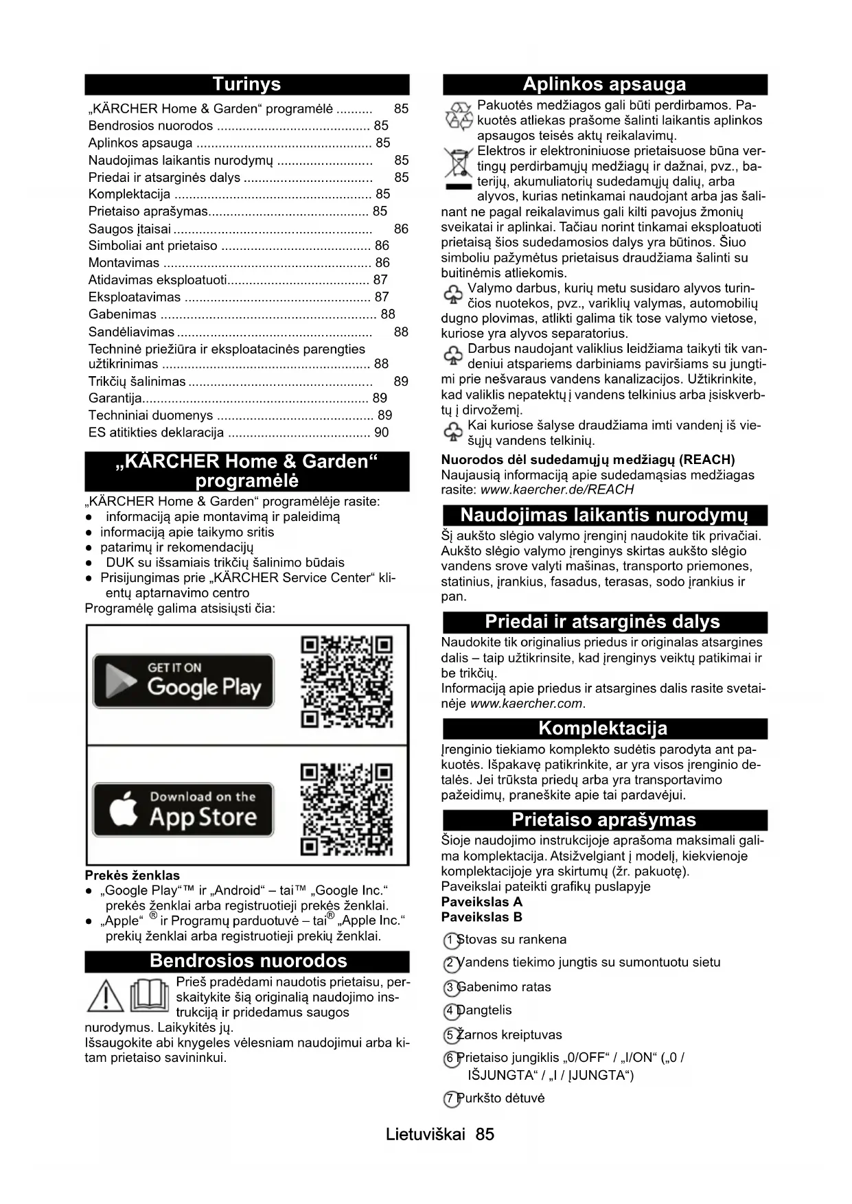 dB(A) 90 90 Control Premium Power Control K 4 Flex Power K 4 Flex PowerLietuviškai 85 Turinys „KÄRCHER Home & Garden“ programėlė „KÄRCHER Home & Garden“ programėlėje rasite: ● informaciją apie montavimą ir paleidimą ● informaciją apie taikymo sritis ● patarimų ir rekomendacijų ● DUK su išsamiais trikčių šalinimo būdais ● Prisijungimas prie „KÄRCHER Service Center“ kli- entų aptarnavimo centro Programėlę galima atsisiųsti čia: Prekės ženklas ● „Google Play“™ ir „Android“ – tai™ „Google Inc.“ prekės ženklai arba registruotieji prekės ženklai. ● „Apple“