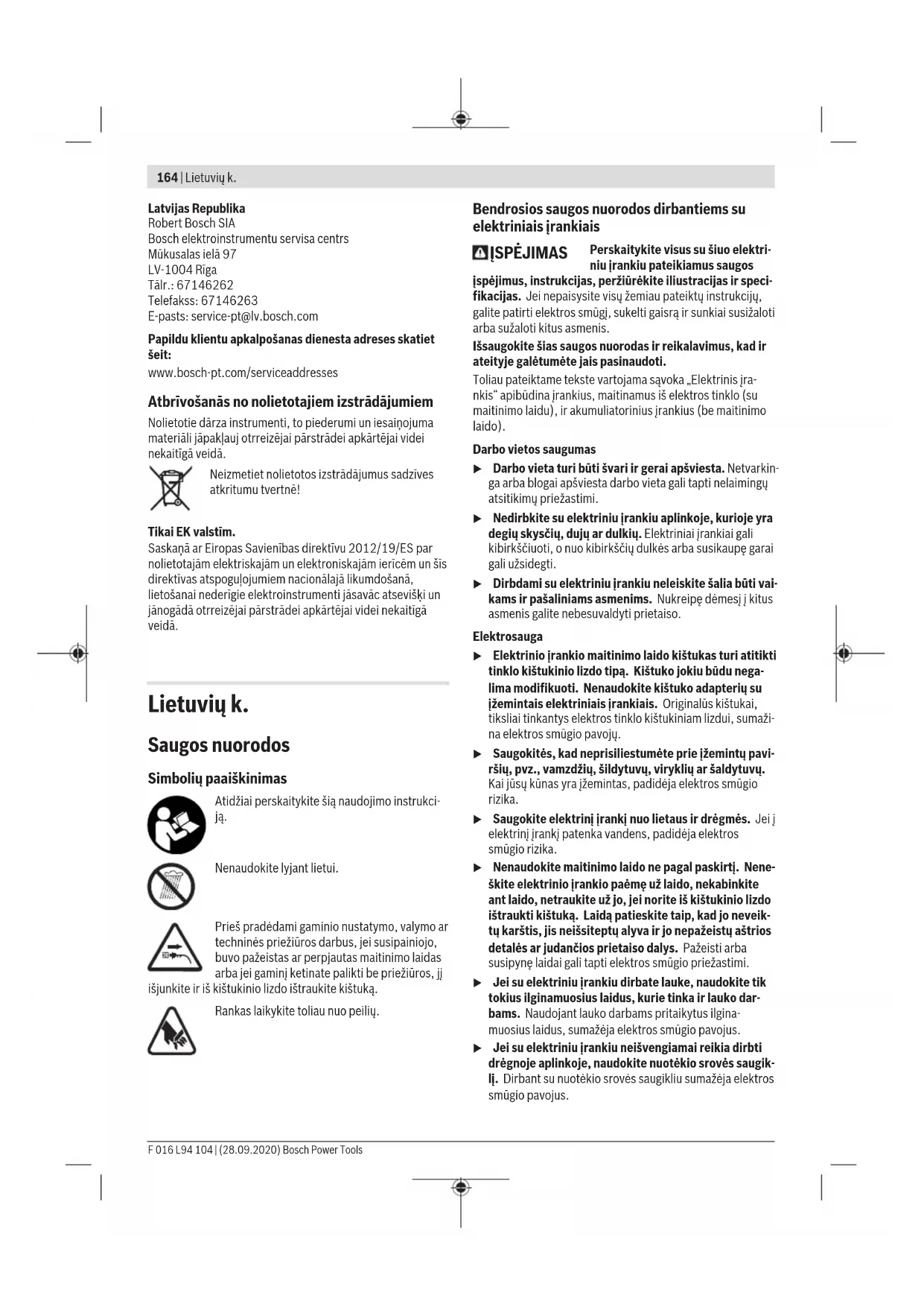 Lietošana u Pievadiet izstrādājumam pareizu elektrotīkla spriegumu! Elektrobarošanas avota spriegumam jāatbilst vērtībai, kas norādīta uz dārza instrumenta marķējuma plāksnītes. Ieslēgšana un izslēgšana (attēli C un D) Lai ieslēgtu dārza instrumentu, vispirms nospiediet ieslēdzēja atbloķ/ēšanas taustiņu (3) un turiet to nospiestu. Pēc tam nospiediet ieslēdzēju (2) un turiet to nospiestu. Lai izslēgtu dārza instrumentu, attlaidiet ieslēdzēja atbloķēšanas taustiņu (3) un pēc tam atlaidiet ieslēdzēju (2). Darbs ar dzīvžoga šķērēm (attēls E) Vienmērīgi pārvietojiet dzīvžoga šķēres uz priekšu pa apgriešanas līniju. Instrumenta asmeņu vadotne ir divpusēja, tāpēc dzīvžogu iespējams apgriezt abos virzienos vai arī strādāt, pārvietojot asmeņu vadotni uz priekšu un atpakaļ. F 016 L94 104 | (28.09.2020) Bosch Power ToolsLatviešu | 163 Vispirms apgrieziet dzīvžoga sānu malas un tad apstrādājiet tā augšējo malu. Lai panāktu līdzenas dzīvžoga sānu malas, dzīvžoga apgriešanu ieteicams veikt no apakšas augšup. Ja dzīvžogs tiek apgriezts no augšas lejup, krūmaugu tievākie zari izvirzās ārā no dzīvžoga un tiek apgriezti nelīdzeni, kā rezultātā dzīvžogā veidojas rievas un iekritumi. Lai līdzeni apgrieztu dzīvžoga augšējo malu, novelciet vajadzīgajā augstumā auklu, kas stiepjas gar dzīvžogu visā tā garumā. Pie tam sekojiet, lai netiktu griezti svešķermeņi, piemēram, stieples. Šādā gadījumā var tikt bojāts piedziņas mehānisms. Kļūmju uzmeklēšana Pazīme Iespējamais cēlonis Novēršana Dzīvžoga šķēres nedarbojas Elektrotīklā nav sprieguma Pārbaudiet elektrotīklu un ieslēdziet spriegumu Ir bojāta kontaktligzda Izmantojiet citu kontaktligzdu Ir bojāts elektrotīkla kabelis Pārbaudiet elektrotīkla kabeli un, ja tas ir bojāts, griezieties klientu apkalpošanas uzņēmumā Ir bojāts pagarinātājkabelis Pārbaudiet pagarinātājkabeli un nomainiet, ja tas ir bojāts Ir pārdedzis drošinātājs Nomainiet drošinātāju Dzīvžoga šķēres darbojas ar pārtraukumiem Ir bojāti dārza instrumenta iekšējie savienojumi Griezieties klientu apkalpošanas uzņēmumā Ir bojāts ieslēdzējs Griezieties klientu apkalpošanas uzņēmumā Dzinējs darbojas, bet griezējasmens nekustas Kļūme mehānismā Griezieties klientu apkalpošanas uzņēmumā Asmeņi karst Asmens ir kļuvis neass Pieslīpējiet asmeņu vadotni Asmeņos ir izveidojušies robi Pārbaudiet asmeņu vadotnes stāvokli Pārāk liela berze nepietiekošas eļļošanas dēļ Apsmidziniet asmeņu vadotni ar smēreļļu Izstrādājums stipri vibrē un/vai trokšņo Dārza instruments ir bojāts Griezieties klientu apkalpošanas uzņēmumā Apkalpošana un apkope Apkalpošana, tīrīšana un uzglabāšana u Pirms jebkura darba ar izstrādājumu atvienojiet tā kontaktdakšu no elektrotīkla kontaktligzdas. u Lai varētu strādāt droši un efektīvi, uzturiet izstrādājumu tīru. Nenovietojiet uz dārza instrumenta citus priekšmetus. Lai varētu strādāt droši un efektīvi, uzturiet tīru izstrādājumu un jo īpaši tā ventilācijas atveres. Neapsmidziniet izstrādājumu ar ūdeni. Neiegremdējiet izstrādājumu ūdenī. Uzglabājiet izstrādājumu sausā un drošā vietā, kur tam nevar piekļūt bērni. Nenovietojiet uz izstrādājuma citus priekšmetus. Lai būtu iespējams droši strādāt ar dārza instrumentu, pārbaudiet, vai ir stingri pieskrūvēti visi tā uzgriežņi un skrūves. Lai panāktu augstu darba drošību, regulāri pārbaudiet dārza instrumentu un nomainiet tā izdilušās vai bojātās daļas. Nodrošiniet, lai nomaiņai tiktu izmantotas vienīgi oriģinālās rezerves daļas, kas ražotas firmā Bosch. Klientu apkalpošanas dienests un konsultācijas par lietošanu Klientu apkalpošanas dienests atbildēs uz Jūsu jautājumiem par izstrādājumu remontu un apkalpošanu, kā arī par to rezerves daļām. Kopsalikuma attēlus un informāciju par rezerves daļām Jūs varat atrast interneta vietnē: www.bosch-pt.com Bosch konsultantu grupa palīdzēs Jums vislabākajā veidā rast atbildes uz jautājumiem par mūsu izstrādājumiem un to piederumiem. Pieprasot konsultācijas un pasūtot rezerves daļas, noteikti paziņojiet 10 zīmju izstrādājuma numuru, kas norādīts uz izstrādājuma marķējuma plāksnītes. Bosch Power Tools F 016 L94 104 | (28.09.2020)164 | Lietuvių k. Latvijas Republika Robert Bosch SIA Bosch elektroinstrumentu servisa centrs Mūkusalas ielā 97 LV-1004 Rīga Tālr.: 67146262 Telefakss: 67146263 E-pasts: service-pt@lv.bosch.com Papildu klientu apkalpošanas dienesta adreses skatiet šeit: www.bosch-pt.com/serviceaddresses Atbrīvošanās no nolietotajiem izstrādājumiem Nolietotie dārza instrumenti, to piederumi un iesaiņojuma materiāli jāpakļauj otrreizējai pārstrādei apkārtējai videi nekaitīgā veidā. Neizmetiet nolietotos izstrādājumus sadzīves atkritumu tvertnē! Tikai EK valstīm. Saskaņā ar Eiropas Savienības direktīvu 2012/19/ES par nolietotajām elektriskajām un elektroniskajām ierīcēm un šīs direktīvas atspoguļojumiem nacionālajā likumdošanā, lietošanai nederīgie elektroinstrumenti jāsavāc atsevišķi un jānogādā otrreizējai pārstrādei apkārtējai videi nekaitīgā veidā. Lietuvių k. Saugos nuorodos Simbolių paaiškinimas Atidžiai perskaitykite šią naudojimo instrukci- ją. Nenaudokite lyjant lietui. Prieš pradėdami gaminio nustatymo, valymo ar techninės priežiūros darbus, jei susipainiojo, buvo pažeistas ar perpjautas maitinimo laidas arba jei gaminį ketinate palikti be priežiūros, jį išjunkite ir iš kištukinio lizdo ištraukite kištuką. Rankas laikykite toliau nuo peilių. Bendrosios saugos nuorodos dirbantiems su elektriniais įrankiais ĮSPĖJIMAS Perskaitykite visus su šiuo elektri- niu įrankiu pateikiamus saugos įspėjimus, instrukcijas, peržiūrėkite iliustracijas ir 