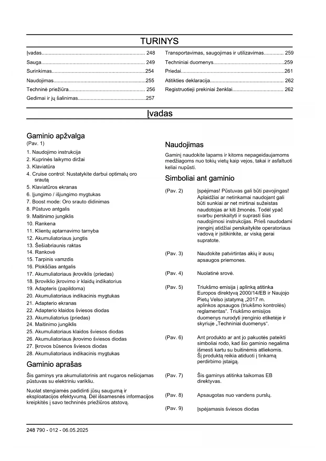 Gaminio aprašas Šis gaminys yra akumuliatorinis ant nugaros nešiojamas pūstuvas su elektriniu varikliu. Nuolat stengiamės padidinti jūsų saugumą ir eksploatacijos efektyvumą. Dėl išsamesnės informacijos kreipkitės į savo techninės priežiūros atstovą. Naudojimas Gaminį naudokite lapams ir kitoms nepageidaujamoms medžiagoms nuo tokių vietų kaip vejos, takai ir asfaltuoti keliai nupūsti. Simboliai ant gaminio (Pav. 2) Įspėjimas! Pūstuvas gali būti pavojingas! Aplaidžiai ar netinkamai naudojant gali būti sunkiai ar net mirtinai sužeistas naudotojas ar kiti žmonės. Todėl ypač svarbu perskaityti ir suprasti šias naudojimosi instrukcijas. Prieš naudodami įrenginį atidžiai perskaitykite operatoriaus vadovą ir įsitikinkite, ar viską gerai supratote. (Pav. 3) Naudokite patvirtintas akių ir ausų apsaugos priemones. (Pav. 4) Nuolatinė srovė. (Pav. 5) Triukšmo emisija į aplinką atitinka Europos direktyvą 2000/14/EB ir Naujojo Pietų Velso įstatymą „2017 m. aplinkos apsaugos (triukšmo kontrolės) reglamentas“. Triukšmo emisijos duomenys nurodyti įrenginio etiketėje ir skyriuje „Techniniai duomenys“. (Pav. 6) Ant produkto ar ant jo pakuotės pateikti simboliai rodo, kad šio gaminio negalima išmesti kartu su buitinėmis atliekomis. Šį produktą reikia atiduoti į tinkamą perdirbimo įstaigą. (Pav. 7) Šis gaminys atitinka taikomas EB direktyvas. (Pav. 8) Apsaugotas nuo vandens purslų. (Pav. 9) Įspėjamasis šviesos diodas 248 790 - 012 - 06.05.2025(Pav. 10) Įjungimo / išjungimo mygtukas (Pav. 11) Boost mode mygtukas (Pav. 12) Cruise control mygtukas (Pav. 13) Jei gaminyje naudojama „Bluetooth