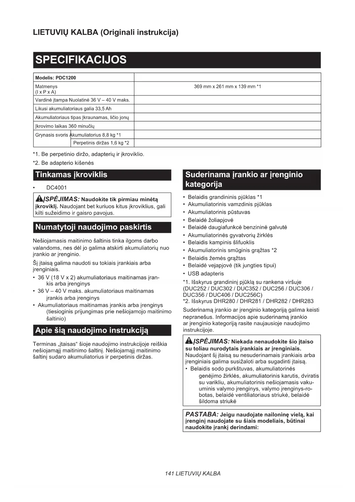 - DC4001 ĮSPĖJIMAS: Naudokite tik pirmiau minėtą įkroviklį. Naudojant bet kuriuos kitus įkroviklius, gali kilti sužeidimo ir gaisro pavojus. Numatytoji naudojimo paskirtis Nešiojamasis maitinimo šaltinis tinka ilgoms darbo valandoms, nes dėl jo galima atskirti akumuliatorių nuo įrankio ar įrenginio. Šį įtaisą galima naudoti su tokiais įrankiais arba įrenginiais.