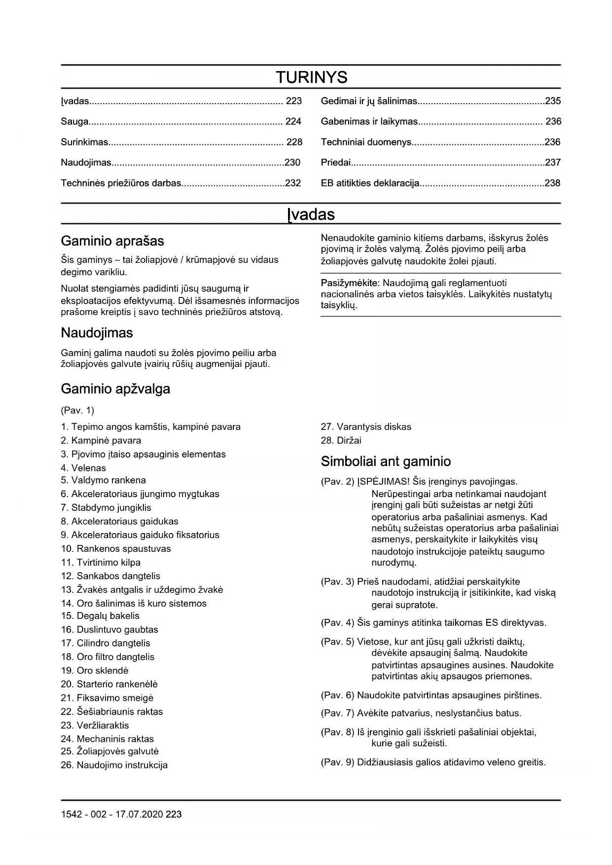 - Nenaudokite gaminio, jei pasikeitė jo pradiniai techniniai duomenys. Nekeiskite gaminio dalių, neturinčių gamintojo patvirtinimo. Naudokite tik gamintojo patvirtintas dalis. Netinkamai prižiūrint gaminį galima susižeisti arba žūti. 224 1542 - 002 - 17.07.2020• Neįkvėpkite variklio skleidžiamų dujų. Ilgalaikis kvėpavimas variklio išmetamosiomis dujomis pavojingas gyvybei.