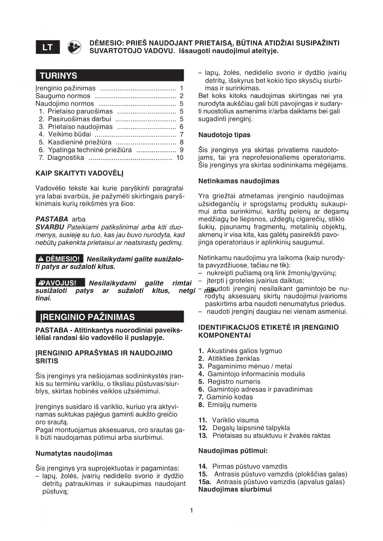 Nešvari žvakė arba tarp elektrodų netinkamas atstumas Patikrinti žvakę (žr sk. 5) Karbiuracijos problemos Susisiekti su pardavėju Surinkimo krepšys pilnas arba užsikimšęs Ištuštinti krepšį (žiūr.str. 4)1 SATURS Iepazīšanās ar mašīnu ................................... 1 Drošības noteikumi ........................................ 2 Lietošanas noteikumi ..................................... 5