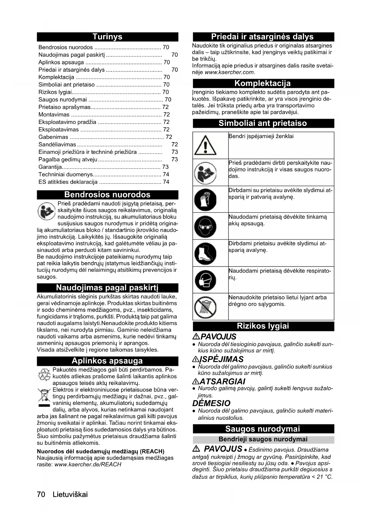 - <2,5 Darba spiediens (maks.) bar 3 Padeves daudzums (maks.) l/h 30 Izmēri un svars Šļūtenes garums cm 120 Teleskopiskā smidzināšanas stob- ra garums cm 45 - 75 Svars (bez akumulatoru pakas) kg 2,4 Garums x platums x augstums mm 750 x 185 x 36570 Lietuviškai Turinys Bendrosios nuorodos Prieš pradėdami naudoti įsigytą prietaisą, per- skaitykite šiuos saugos reikalavimus, originalią naudojimo instrukciją, su akumuliatoriaus bloku susijusius saugos nurodymus ir pridėtą origina- lią akumuliatoriaus bloko / standartinio įkroviklio naudo- jimo instrukciją. Laikykitės jų. Išsaugokite originalią eksploatavimo instrukciją, kad galėtumėte vėliau ja pa- sinaudoti arba perduoti kitam savininkui. Be naudojimo instrukcijoje pateikiamų nurodymų taip pat reikia laikytis bendrųjų įstatymus leidžiančiųjų insti- tucijų nurodymų dėl nelaimingų atsitikimų prevencijos ir saugos. Naudojimas pagal paskirtį Akumuliatorinis slėginis purkštas skirtas naudoti lauke, gerai vėdinamoje aplinkoje. Produktas skirtas buitinėms ir sodo cheminėms medžiagoms, pvz., insekticidams, fungicidams ir trąšoms, purkšti. Produktą taip pat galima naudoti augalams laistyti.Nenaudokite produkto kitiems tikslams, nei nurodyta pirmiau. Gaminio neleidžiama naudoti vaikams arba asmenims, kurie nedėvi tinkamų asmeninių apsaugos priemonių ir aprangos. Visada atsižvelkite į regione taikomas taisykles. Aplinkos apsauga Pakuotės medžiagos gali būti perdirbamos. Pa- kuotės atliekas prašome šalinti laikantis aplinkos apsaugos teisės aktų reikalavimų. Elektros ir elektroniniuose prietaisuose būna ver- tingų perdirbamųjų medžiagų ir dažnai, pvz., gal- vaninių elementų, akumuliatorių sudedamųjų dalių, arba alyvos, kurias netinkamai naudojant arba jas šalinant ne pagal reikalavimus gali kilti pavojus žmonių sveikatai ir aplinkai. Tačiau norint tinkamai eks- ploatuoti prietaisą šios sudedamosios dalys yra būtinos. Šiuo simboliu pažymėtus prietaisus draudžiama šalinti su buitinėmis atliekomis. Nuorodos dėl sudedamųjų medžiagų (REACH) Naujausią informaciją apie sudedamąsias medžiagas rasite: www.kaercher.de/REACH Priedai ir atsarginės dalys Naudokite tik originalius priedus ir originalas atsargines dalis – taip užtikrinsite, kad įrenginys veiktų patikimai ir be trikčių. Informaciją apie priedus ir atsargines dalis rasite svetai- nėje www.kaercher.com. Komplektacija Įrenginio tiekiamo komplekto sudėtis parodyta ant pa- kuotės. Išpakavę patikrinkite, ar yra visos įrenginio de- talės. Jei trūksta priedų arba yra transportavimo pažeidimų, praneškite apie tai pardavėjui. Simboliai ant prietaiso Rizikos lygiai PAVOJUS ● Nuoroda dėl tiesioginio pavojaus, galinčio sukelti sun- kius kūno sužalojimus ar mirtį. 몇 ĮSPĖJIMAS ● Nuoroda dėl galimo pavojaus, galinčio sukelti sunkius kūno sužalojimus ar mirtį. 몇 ATSARGIAI ● Nurodo galimą pavojų, galintį sukelti lengvus sužalo- jimus. DĖMESIO ● Nuoroda dėl galimo pavojaus, galinčio sukelti materi- alinius nuostolius. Saugos nurodymai Bendrieji saugos nurodymai PAVOJUS ● Ėsdinimo pavojus. Draudžiama antgalį nukreipti į žmogų ar gyvūną. Pasirūpinkite, kad srovė tiesiogiai nesiliestų su jūsų oda. ● Pavojus apsi- deginti. Šiuo prietaisu draudžiama purkšti degiuosius s dažus ar tirpiklius, kurių pliūpsnio temperatūra < 21 °C. Bendrosios nuorodos p. 70