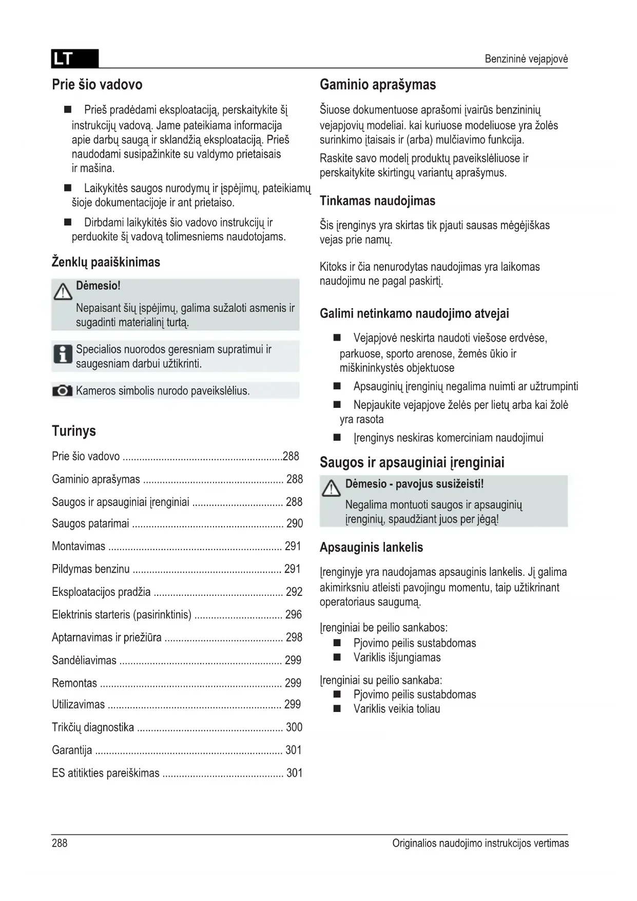 - ES atitikties pareiškimas Prie šio vadovo Prieš pradėdami eksploataciją, perskaitykite šį instrukcijų vadovą. Jame pateikiama informacija apie darbų saugą ir sklandžią eksploataciją. Prieš naudodami susipažinkite su valdymo prietaisais ir mašina. Laikykitės saugos nurodymų ir įspėjimų, pateikiamų šioje dokumentacijoje ir ant prietaiso. Dirbdami laikykitės šio vadovo instrukcijų ir perduokite šį vadovą tolimesniems naudotojams. Ženklų paaiškinimas Dėmesio! Nepaisant šių įspėjimų, galima sužaloti asmenis ir sugadinti materialinį turtą. Specialios nuorodos geresniam supratimui ir saugesniam darbui užtikrinti. Kameros simbolis nurodo paveikslėlius. Gaminio aprašymas Šiuose dokumentuose aprašomi įvairūs benzininių vejapjovių modeliai. kai kuriuose modeliuose yra žolės surinkimo įtaisais ir (arba) mulčiavimo funkcija. Raskite savo modelį produktų paveikslėliuose ir perskaitykite skirtingų variantų aprašymus. Tinkamas naudojimas Šis įrenginys yra skirtas tik pjauti sausas mėgėjiškas vejas prie namų. Kitoks ir čia nenurodytas naudojimas yra laikomas naudojimu ne pagal paskirtį. Galimi netinkamo naudojimo atvejai Vejapjovė neskirta naudoti viešose erdvėse, parkuose, sporto arenose, žemės ūkio ir miškininkystės objektuose Apsauginių įrenginių negalima nuimti ar užtrumpinti Nepjaukite vejapjove želės per lietų arba kai žolė yra rasota Įrenginys neskiras komerciniam naudojimui Saugos ir apsauginiai įrenginiai Dėmesio - pavojus susižeisti! Negalima montuoti saugos ir apsauginių įrenginių, spaudžiant juos per jėgą! Apsauginis lankelis Įrenginyje yra naudojamas apsauginis lankelis. Jį galima akimirksniu atleisti pavojingu momentu, taip užtikrinant operatoriaus saugumą. Įrenginiai be peilio sankabos: Pjovimo peilis sustabdomas Variklis išjungiamas Įrenginiai su peilio sankaba: Pjovimo peilis sustabdomas Variklis veikia toliauLT 289470 591_c 1 Starterio trosas 9 Pjovimo aukščio reguliatorius* 2 Paleidimas, sustabdymas* 10 Peilio sankaba* 3 Ratų pavara* 11 Kintamo greičio pavara* 4 Apsauginis lankelis 12 Naudojimo instrukcija 5 Ergonomiško pjovimo aukščio reguliatorius* 13 Žolės išmetimo įtaisas* 6 Pripildymo lygio rodiklis* 14 Užsikimšimo sklendė* 7 Išmetimo angos dangtelis* 15 Mulčiavimo priedas* 8 Žolės surinkimo talpa* * priklauso nuo komplektacijos Simboliai ant prietaisų Dėmesio! Dirbkite ypač atsargiai. Prieš atlikdami darbus su pjovimo mechanizmu atjunkite degimo žvakės kištuką. Prieš eksploataciją perskaitykite naudojimo instrukciją! Atjunkite variklio stabdį. Saugokitės, kad į darbo zoną neįeitų pašalinių asmenų! Įjunkite ratų pavarą. Saugokite rankas ir kojas nuo peilių! p. 301