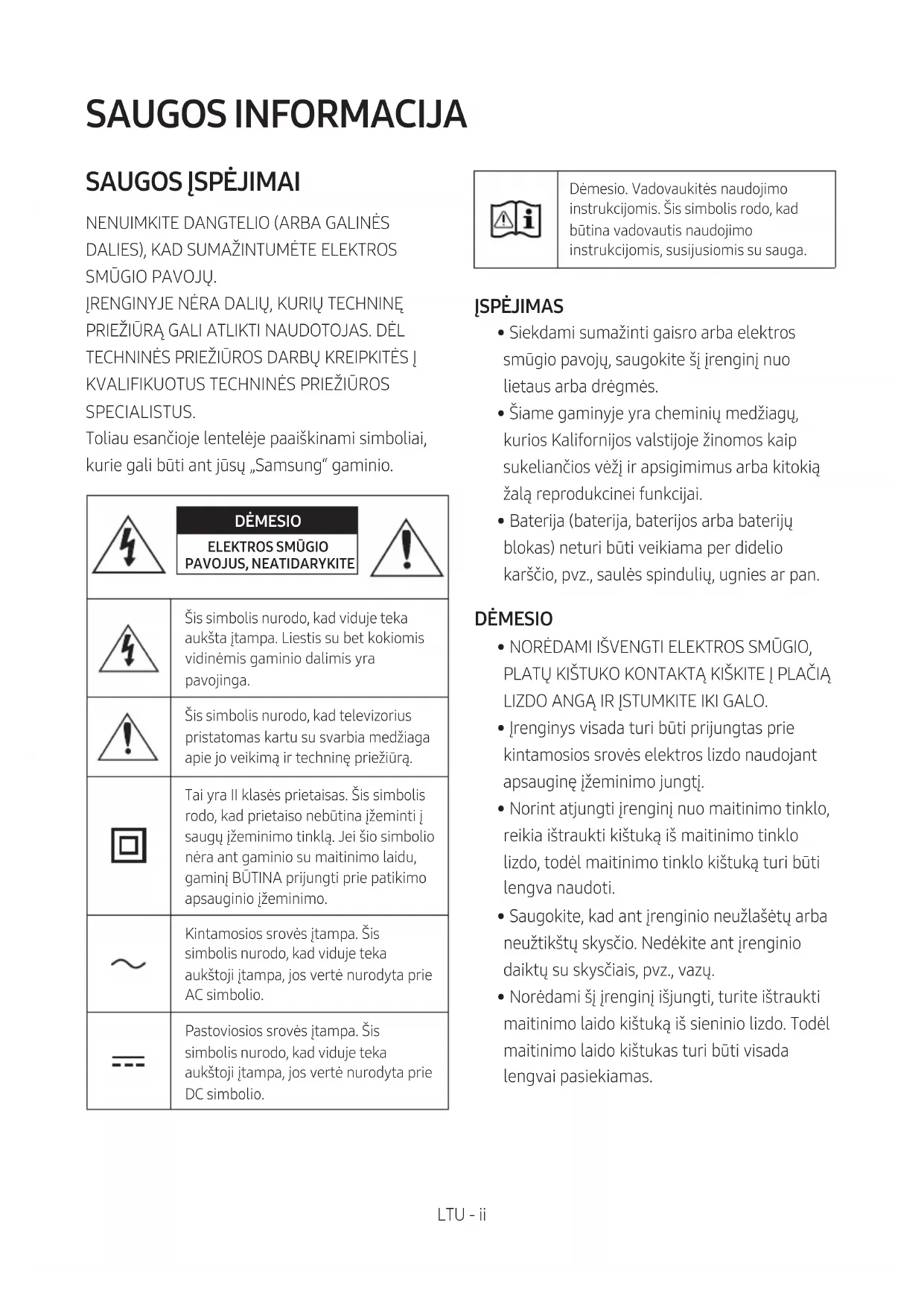 SPECIALISTUS. Toliau esančioje lentelėje paaiškinami simboliai, kurie gali būti ant jūsų „Samsung“ gaminio. DĖMESIO ELEKTROSSMŪGIOPAVOJUS, NEATIDARYKITEŠis simbolis nurodo, kad viduje teka aukšta įtampa. Liestis su bet kokiomis vidinėmis gaminio dalimis yra pavojinga.Šis simbolis nurodo, kad televizorius pristatomas kartu su svarbia medžiaga apie jo veikimą ir techninę priežiūrą.Tai yra II klasės prietaisas. Šis simbolis rodo, kad prietaiso nebūtina įžeminti į saugų įžeminimo tinklą. Jei šio simbolio nėra ant gaminio su maitinimo laidu, gaminį BŪTINA prijungti prie patikimo apsauginio įžeminimo. Kintamosios srovės įtampa. Šis simbolis nurodo, kad viduje teka aukštoji įtampa, jos vertė nurodyta prie AC simbolio.Pastoviosios srovės įtampa. Šis simbolis nurodo, kad viduje teka aukštoji įtampa, jos vertė nurodyta prie DC simbolio.Dėmesio. Vadovaukitės naudojimo instrukcijomis. Šis simbolis rodo, kad būtina vadovautis naudojimo instrukcijomis, susijusiomis su sauga. ĮSPĖJIMAS