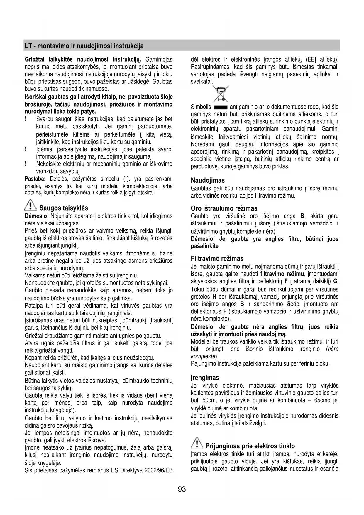 Ja apgaismojums nedarbojas, pārbaudīt, vai spuldze ir pareizi ievietota, pirms griezties pie tehniskā servisa.93 LT - montavimo ir naudojimosi instrukcija Griežtai laikykitės naudojimosi instrukcijų. Gamintojas neprisiima jokios atsakomybės, jei montuojant prietaisą buvo nesilaikoma naudojimosi instrukcijoje nurodytų taisyklių ir tokiu būdu prietaisas sugedo, buvo pažeistas ar užsidegė. Gaubtas buvo sukurtas naudoti tik namuose. Išoriškai gaubtas gali atrodyti kitaip, nei pavaizduota šioje brošiūroje, tačiau naudojimosi, priežiūros ir montavimo nurodymai lieka tokie patys. ! Svarbu saugoti šias instrukcijas, kad galėtumėte jas bet kuriuo metu pasiskaityti. Jei gaminį parduotumėte, perleistumėte kitiems ar perkeltumėte į kitą vietą, įsitikinkite, kad instrukcijos liktų kartu su gaminiu. ! Įdėmiai perskaitykite instrukcijas: jose pateikta svarbi informacija apie įdiegimą, naudojimą ir saugumą. ! Nekeiskite elektrinių ar mechaninių gaminio ar iškrovimo vamzdžių savybių. Pastaba: Detalės, pažymėtos simboliu (*), yra pasirenkami priedai, esantys tik kai kurių modelių komplektacijoje, arba detalės, kurių komplekte nėra ir kurias reikia įsigyti atskirai. Saugos taisyklės Dėmesio! Nejunkite aparato į elektros tinklą tol, kol įdiegimas nėra visiškai užbaigtas. Prieš bet kokį priežiūros ar valymo veiksmą, reikia išjungti gaubtą iš elektros srovės šaltinio, ištraukiant kištuką iš rozetės arba išjungiant jungiklį. Įrenginiu nepatariama naudotis vaikams, žmonėms su fizine arba protine negalia be už juos atsakingo asmens priežiūros arba specialių nurodymų. Vaikams neturi būti leidžiama žaisti su įrenginiu. Nenaudokite gaubto, jei grotelės sumontuotos netaisyklingai. Gaubto niekada nenaudokite kaip atramos, nebent toks jo naudojimo būdas yra nurodytas kaip galimas. Patalpa turi būti gerai vėdinama, kai virtuvės gaubtas yra naudojamas kartu su kitais dujinių įrenginiais. Įsiurbiamas oras neturi būti nukreiptas į dūmtraukį, įtraukiantį garus, išeinančius iš dujinių bei kitų įrenginių. Griežtai draudžiama gaminti maistą ant ugnies po gaubtu. Atvira ugnis pažeidžia filtrus ir gali sukelti gaisrą, todėl jos reikia griežtai vengti. Kepant reikia prižiūrėti, kad įkaitęs aliejus neužsidegtų. Naudojant kartu su maisto gaminimo įranga kai kurios detalės gali stipriai įkaisti. Būtina laikytis vietos valdžios nustatytų dūmtraukio techninių bei saugos taisyklių. Gaubtą reikia valyti tiek iš išorės, tiek iš vidaus (bent vieną kartą per mėnesį arba taip, kaip nurodyta naudojimo instrukcijų knygelėje). Gaubto bei filtrų valymo ir keitimo instrukcijų nesilaikymas didina gaisro pavojaus riziką. Jei lempos neteisingai įmontuotos ar jų nėra, nenaudokite gaubto, gali įvykti elektros iškrova. Įmonė neatsako už įvairius nepatogumus, žalą arba gaisrą, kilusį nesilaikant įrenginio naudojimo instrukcijų, nurodytų šioje knygelėje. Šis prietaisas pažymėtas remiantis ES Direktyva 2002/96/EB dėl elektros ir elektroninės įrangos atliekų, (EEĮ atliekų). Pasirūpindamas, kad šis gaminys būtų išmestas tinkamai, vartotojas padeda išvengti neigiamų pasekmių aplinkai ir sveikatai. Simbolis ant gaminio ar jo dokumentuose rodo, kad šis gaminys neturi būti priskiriamas buitinėms atliekoms, o turi būti pristatytas į tam tikrą atliekų surinkimo punktą elektrinių ir elektroninių aparatų pakartotiniam panaudojimui. Gaminį išmeskite laikydamiesi vietinių atliekų šalinimo normų. Norėdami gauti daugiau informacijos apie šio gaminio apdorojimą, rinkimą ir pakartotinį panaudojimą, kreipkitės į specialią vietinę įstaigą, buitinių atliekų rinkimo centrą ar parduotuvę, kurioje gaminys buvo pirktas. Naudojimas Gaubtas gali būti naudojamas oro ištraukimo į išorę režimu arba vidinės recirkuliacijos filtravimo režimu. Oro ištraukimo režimas Gaubte yra viršutinė oro išėjimo anga B, skirta garų ištraukimui ir pašalinimui į išorę (ištraukiamojo vamzdžio ir užtvirtinimo gnybtų komplekte nėra). Dėmesio! Jei gaubte yra anglies filtrų, būtinai juos pašalinkite Filtravimo režimas Jei maisto gaminimo metu neįmanoma dūmų ir garų ištraukti į išorę, gaubtą galite naudoti filtravimo režimu, įmontuodami aktyviosios anglies filtrą ir deflektorių F į atramą (laikiklį) G. Tokiu būdu dūmai ir garai bus recirkuliuojami per viršutines groteles H per ištraukiamąjį vamzdį, prijungtą prie viršutinės oro išėjimo angos B ir sandarinimo žiedo, įmontuoto ant deflektoriaus F (ištraukiamojo vamzdžio ir užtvirtinimo gnybtų nėra komplekte). Dėmesio! Jei gaubte nėra anglies filtrų, juos reikia užsakyti ir įmontuoti prieš naudojimą. Modeliai be traukos variklio veikia tik ištraukimo režimu ir turi būti prijungti prie išorinio ištraukimo įrenginio (nėra komplekte). Pajungimo instrukcija pateikiama kartu su periferiniu bloku. Įrengimas Jei viryklė elektrinė, mažiausias atstumas tarp viryklės kaitlentės paviršiaus ir žemiausios virtuvinio gaubto dalies turi būti 50cm, o jei viryklė dujinė ar kombinuota – 65cmo jei viryklė dujinė ar kombinuota. Jei dujinės viryklės įrengimo instrukcijoje nurodomas didesnis atstumas, būtina į tai atsižvelgti.