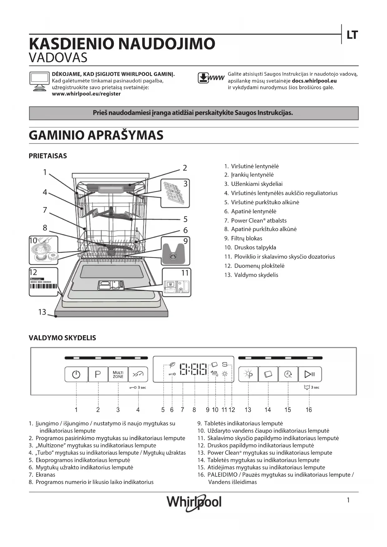 VALDYMO SKYDELISDĖKOJAME, KAD ĮSIGIJOTE WHIRLPOOL GAMINĮ. Kad galėtumėte tinkamai pasinaudoti pagalba,užregistruokite savo prietaisą svetainėje:www.whirlpool.eu/registerGalite atsisiųsti Saugos Instrukcijas ir naudotojo vadovą, apsilankę mūsų svetainėje docs.whirlpool.eu ir vykdydami nurodymus šios brošiūros gale.1. Viršutinė lentynėlė2. Įrankių lentynėlė3. Užlenkiami skydeliai4. Viršutinės lentynėlės aukščio reguliatorius5. Viršutinė purkštuko alkūnė6. Apatinė lentynėlė7. Power Clean® atbalsts8. Apatinė purkštuko alkūnė9. Filtrų blokas10. Druskos talpykla11. Ploviklio ir skalavimo skysčio dozatorius12. Duomenų plokštelė13. Valdymo skydelis1. Įjungimo / išjungimo / nustatymo iš naujo mygtukas su indikatoriaus lempute2. Programos pasirinkimo mygtukas su indikatoriaus lempute3. „Multizone“ mygtukas su indikatoriaus lempute4. „Turbo“ mygtukas su indikatoriaus lempute / Mygtukų užraktas5. Ekoprogramos indikatoriaus lemputė6. Mygtukų užrakto indikatorius lemputė7. Ekranas8. Programos numerio ir likusio laiko indikatorius9. Tabletės indikatoriaus lemputė10. Uždaryto vandens čiaupo indikatoriaus lemputė11. Skalavimo skysčio papildymo indikatoriaus lemputė12. Druskos papildymo indikatoriaus lemputė13. Power Clean® mygtukas su indikatoriaus lempute14. Tabletės mygtukas su indikatoriaus lempute15. Atidėjimas mygtukas su indikatoriaus lempute16. PALEIDIMO / Pauzės mygtukas su indikatoriaus lempute / Vandens išleidimas