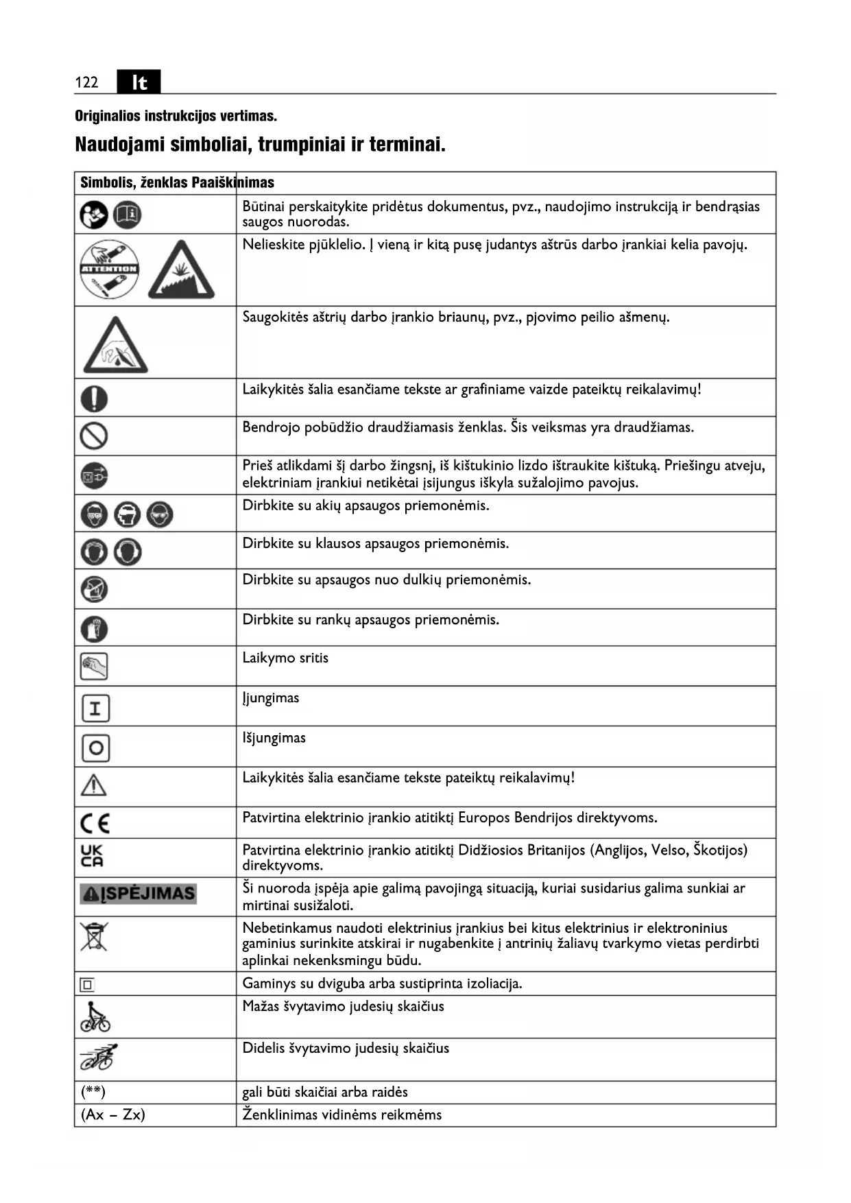 Originalios instrukcijos vertimas. Naudojami simboliai, trumpiniai ir terminai. Simbolis, ženklas Paaiškinimas Būtinai perskaitykite pridėtus dokumentus, pvz., naudojimo instrukciją ir bendrąsias saugos nuorodas. Nelieskite pjūklelio. Į vieną ir kitą pusę judantys aštrūs darbo įrankiai kelia pavojų. Saugokitės aštrių darbo įrankio briaunų, pvz., pjovimo peilio ašmenų. Laikykitės šalia esančiame tekste ar grafiniame vaizde pateiktų reikalavimų! Bendrojo pobūdžio draudžiamasis ženklas. Šis veiksmas yra draudžiamas. Prieš atlikdami šį darbo žingsnį, iš kištukinio lizdo ištraukite kištuką. Priešingu atveju, elektriniam įrankiui netikėtai įsijungus iškyla sužalojimo pavojus. Dirbkite su akių apsaugos priemonėmis. Dirbkite su klausos apsaugos priemonėmis. Dirbkite su apsaugos nuo dulkių priemonėmis. Dirbkite su rankų apsaugos priemonėmis. Laikymo sritis Įjungimas Išjungimas Laikykitės šalia esančiame tekste pateiktų reikalavimų! Patvirtina elektrinio įrankio atitiktį Europos Bendrijos direktyvoms. Patvirtina elektrinio įrankio atitiktį Didžiosios Britanijos (Anglijos, Velso, Škotijos) direktyvoms. Ši nuoroda įspėja apie galimą pavojingą situaciją, kuriai susidarius galima sunkiai ar mirtinai susižaloti. Nebetinkamus naudoti elektrinius įrankius bei kitus elektrinius ir elektroninius gaminius surinkite atskirai ir nugabenkite į antrinių žaliavų tvarkymo vietas perdirbti aplinkai nekenksmingu būdu. Gaminys su dviguba arba sustiprinta izoliacija. Mažas švytavimo judesių skaičius Didelis švytavimo judesių skaičius (**) gali būti skaičiai arba raidės (Ax – Zx) Ženklinimas vidinėms reikmėms123