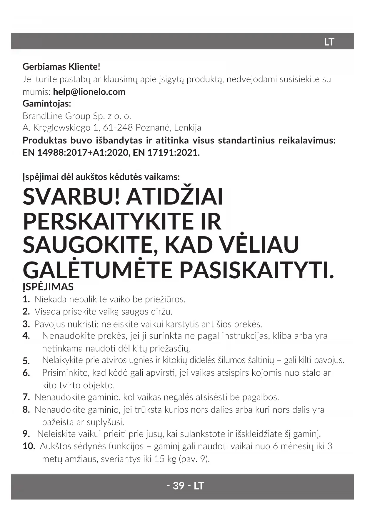 Gerbiamas Kliente! Jei turite pastabų ar klausimų apie įsigytą produktą, nedvejodami susisiekite su mumis: help@lionelo.com Gamintojas: BrandLine Group Sp. z o. o. A. Kręglewskiego 1, 61-248 Poznanė, Lenkija Produktas buvo išbandytas ir atitinka visus standartinius reikalavimus: EN 14988:2017+A1:2020, EN 17191:2021. Įspėjimai dėl aukštos kėdutės vaikams: