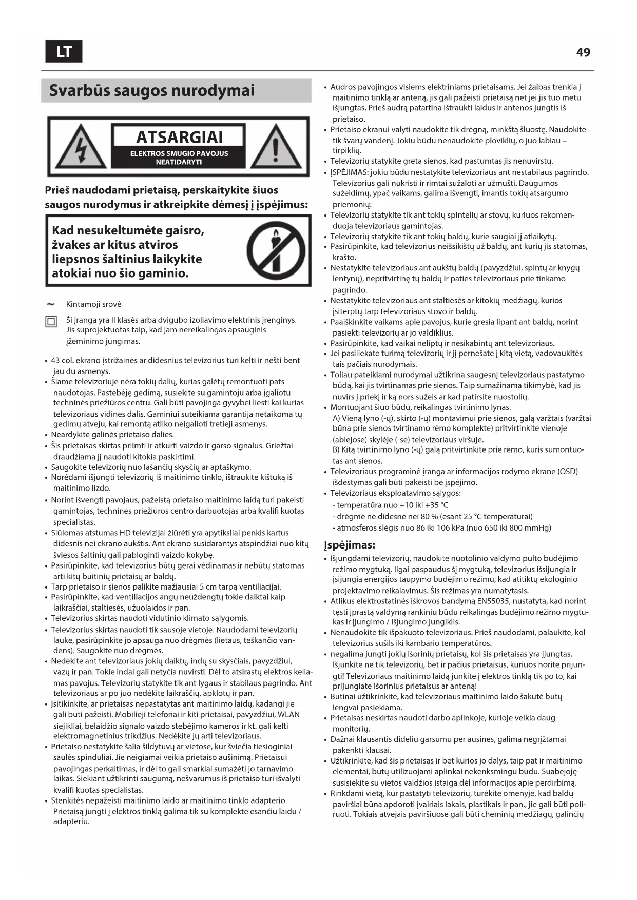- Televizoriaus eksploatavimo sąlygos: - temperatūra nuo +10 iki +35 °C - drėgmė ne didesnė nei 80 % (esant 25 °C temperatūrai) - atmosferos slėgis nuo 86 iki 106 kPa (nuo 650 iki 800 mmHg) Įspėjimas: