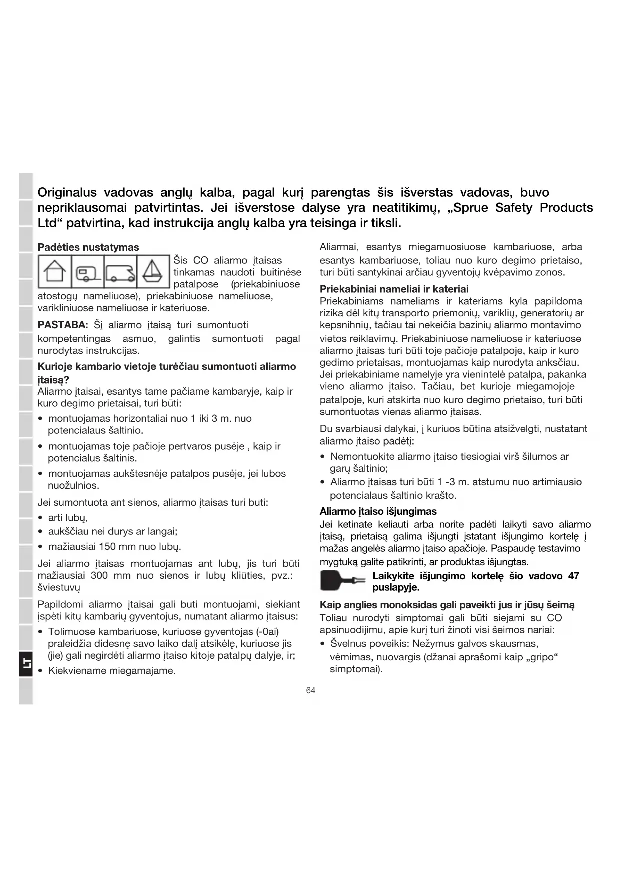 Padėties nustatymas Šis CO aliarmo įtaisas tinkamas naudoti buitinėse patalpose (priekabiniuose atostogų nameliuose), priekabiniuose nameliuose, varikliniuose nameliuose ir kateriuose. PASTABA: Šį aliarmo įtaisą turi sumontuoti kompetentingas asmuo, galintis sumontuoti pagal nurodytas instrukcijas. Kurioje kambario vietoje turėčiau sumontuoti aliarmo įtaisą? Aliarmo įtaisai, esantys tame pačiame kambaryje, kaip ir kuro degimo prietaisai, turi būti: