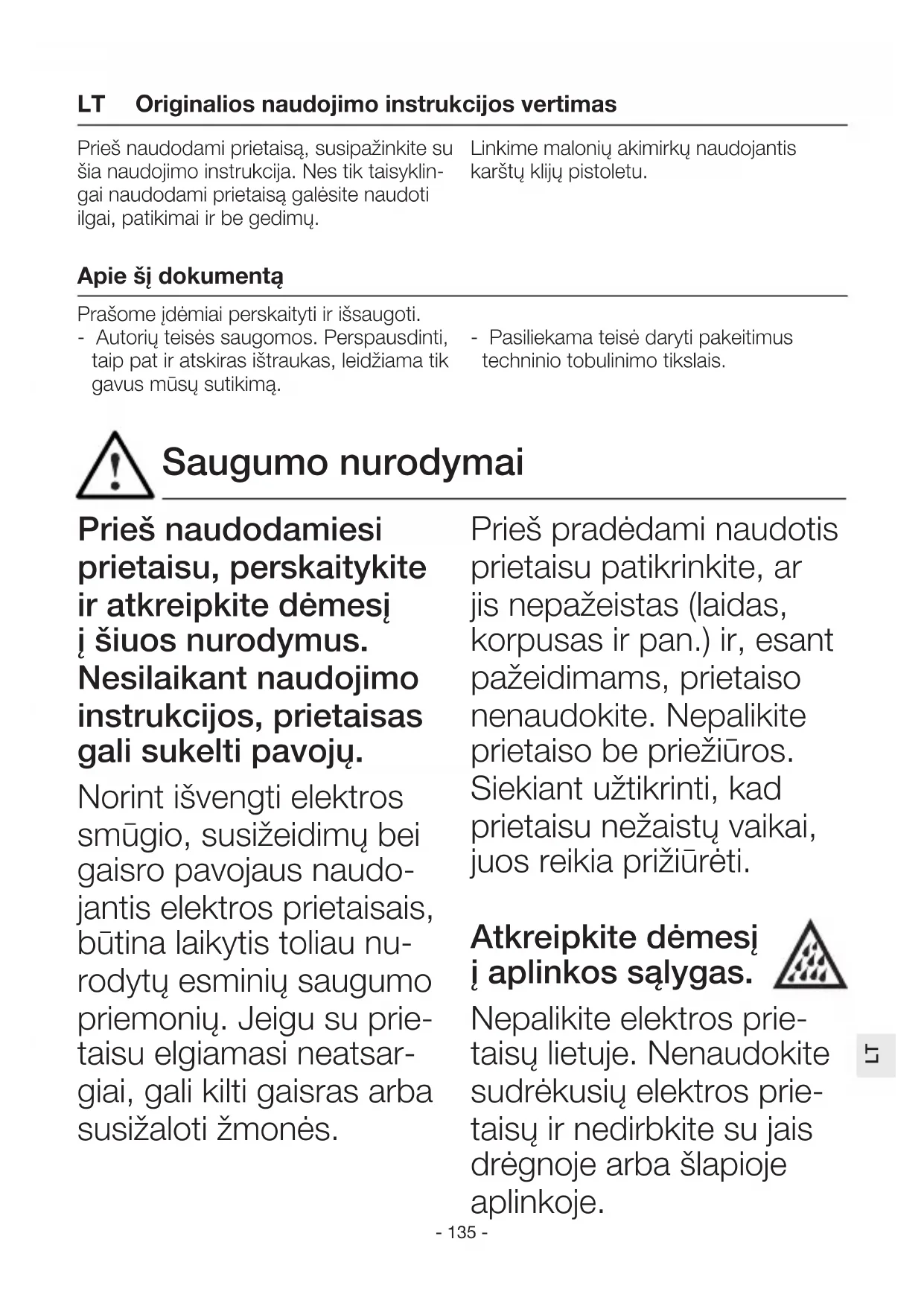 Prieš naudodamiesi prietaisu, perskaitykite ir atkreipkite dėmesį į šiuos nurodymus. Nesilaikant naudojimo instrukcijos, prietaisas gali sukelti pavojų. Norint išvengti elektros smūgio, susižeidimų bei gaisro pavojaus naudo- jantis elektros prietaisais, būtina laikytis toliau nu- rodytų esminių saugumo priemonių. Jeigu su prie- taisu elgiamasi neatsar- giai, gali kilti gaisras arba susižaloti žmonės. Prieš pradėdami naudotis prietaisu patikrinkite, ar jis nepažeistas (laidas, korpusas ir pan.) ir, esant pažeidimams, prietaiso nenaudokite. Nepalikite prietaiso be priežiūros. Siekiant užtikrinti, kad prietaisu nežaistų vaikai, juos reikia prižiūrėti. Atkreipkite dėmesį į aplinkos sąlygas. Nepalikite elektros prie- taisų lietuje. Nenaudokite sudrėkusių elektros prie- taisų ir nedirbkite su jais drėgnoje arba šlapioje aplinkoje. Prieš naudodami prietaisą, susipažinkite su šia naudojimo instrukcija. Nes tik taisyklin- gai naudodami prietaisą galėsite naudoti ilgai, patikimai ir be gedimų. Linkime malonių akimirkų naudojantis karštų klijų pistoletu. Originalios naudojimo instrukcijos vertimas Apie šį dokumentą Prašome įdėmiai perskaityti ir išsaugoti. - Autorių teisės saugomos. Perspausdinti, taip pat ir atskiras ištraukas, leidžiama tik gavus mūsų sutikimą. - Pasiliekama teisė daryti pakeitimus techninio tobulinimo tikslais. Saugumo nurodymai LT- 136 - Būkite atsargūs naudoda- mi prietaisus šalia degių medžiagų. Nelaikykite prietaiso ilgai nukreipę į vieną vietą. Nenaudoki- te potencialiai sprogioje aplinkoje. Išsiskirianti šiluma gali prasiskverbti iki uždengtų degių me- džiagų. Saugokitės elektros smūgio. Venkite kūnu paliesti įže- mintas dalis, pavyzdžiui vamzdžius, radiatorius, virykles, šaldytuvus. Nepalikite veikiančio prie- taiso be priežiūros. Laikykite savo dar- bo įrankius saugiai. Prieš supakuodami pa- naudotą prietaisą, pa- dėkite jį ant atraminio paviršiaus ir leiskite jam atvėsti. Nenaudojamus įrankius reikia laikyti sausoje, už- daroje patalpoje, vaikams nepasiekiamoje vietoje. Vaikai nuo 8 metų am- žiaus ir asmenys, turintys fizinę, jutiminę arba proti- nę negalią bei stokojantys patirties ir žinių, gali nau- doti šį prietaisą, jei juos prižiūri kitas asmuo arba jie yra supažindinti, kaip saugiai naudoti prietaisą, ir supranta su tuo susiju- sius pavojus. Negalima leisti vaikams žaisti su prietaisu. Valyti ir atlikti naudoto- jo atliekamą techninę priežiūrą negalima leisti vaikams be kito asmens priežiūros. Neviršykite darbo įrankių apkrovos. Neviršydami nurodyto ga- lingumo dirbsite geriau ir Saugumo nurodymai- 137 -