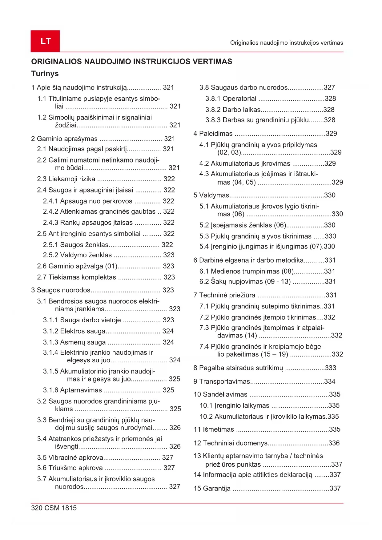 Nepjaukite šakų, kurios yra iš karto virš nau- dotojo arba kitų asmenų arba smailiu kampu į juos.LT 322 CSM 1815 Gaminio aprašymas