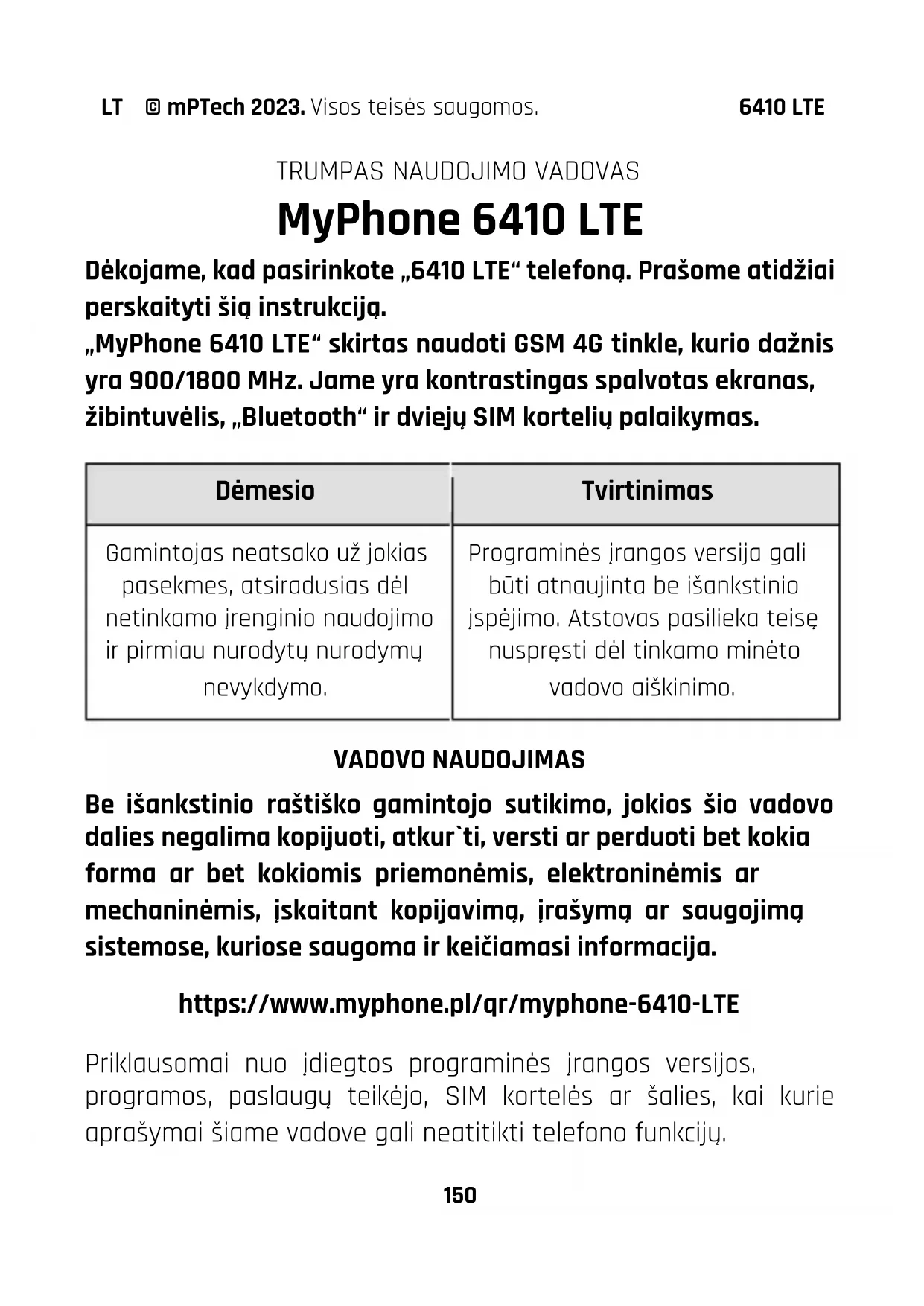 MyPhone 6410 LTE Dėkojame, kad pasirinkote „6410 LTE“ telefoną. Prašome atidžiai perskaityti šią instrukciją. „MyPhone 6410 LTE“ skirtas naudoti GSM 4G tinkle, kurio dažnis yra 900/1800 MHz. Jame yra kontrastingas spalvotas ekranas, žibintuvėlis, „Bluetooth“ ir dviejų SIM kortelių palaikymas. Dėmesio Tvirtinimas Gamintojas neatsako už jokias pasekmes, atsiradusias dėl netinkamo įrenginio naudojimo ir pirmiau nurodytų nurodymų nevykdymo. Programinės įrangos versija gali būti atnaujinta be išankstinio įspėjimo. Atstovas pasilieka teisę nuspręsti dėl tinkamo minėto vadovo aiškinimo.