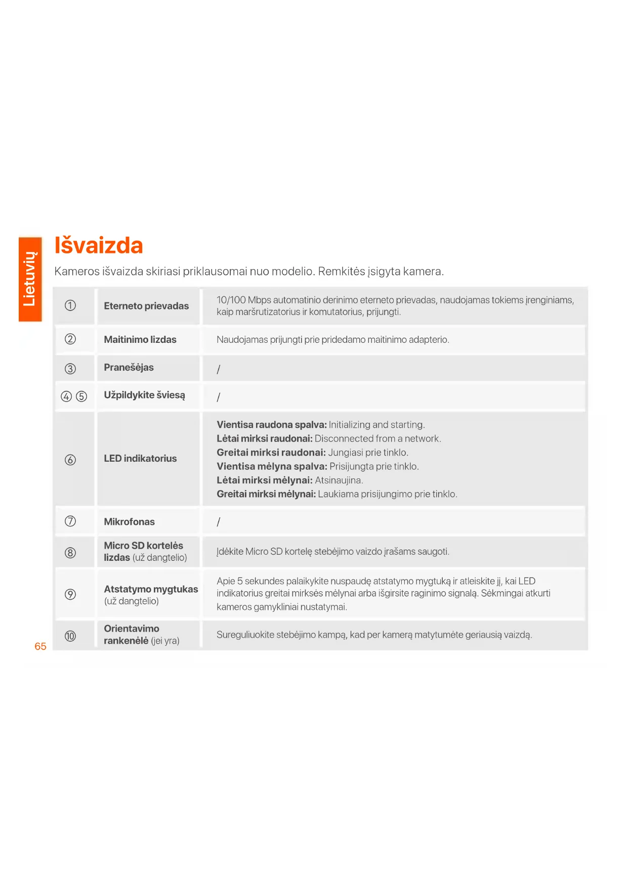 Naudojamas prijungti prie pridedamo maitinimo adapterio. 10/100 Mbps automatinio derinimo eterneto prievadas, naudojamas tokiems įrenginiams, kaip maršrutizatorius ir komutatorius, prijungti. Vientisa raudona spalva: Initializing and starting. Lėtai mirksi raudonai: Disconnected from a network. Greitai mirksi raudonai: Jungiasi prie tinklo. Vientisa mėlyna spalva: Prisijungta prie tinklo. Lėtai mirksi mėlynai: Atsinaujina. Greitai mirksi mėlynai: Laukiama prisijungimo prie tinklo. Įdėkite Micro SD kortelę stebėjimo vaizdo įrašams saugoti. Apie 5 sekundes palaikykite nuspaudę atstatymo mygtuką ir atleiskite jį, kai LED indikatorius greitai mirksės mėlynai arba išgirsite raginimo signalą. Sėkmingai atkurti kameros gamykliniai nustatymai. Sureguliuokite stebėjimo kampą, kad per kamerą matytumėte geriausią vaizdą. Užpildykite šviesą LED indikatorius Mikrofonas Pranešėjas