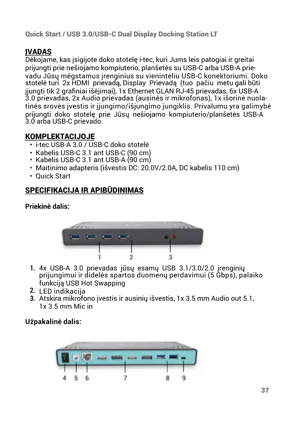 K dispozícii na našom webe www.i-tec.cz v záložke „FAQ“ pri tomto produkte.37 Quick Start / USB 3.0/USB-C Dual Display Docking Station LT ĮVADAS Dėkojame, kas įsigijote doko stotelę i-tec, kuri Jums leis patogiai ir greitai prijungti prie nešiojamo kompiuterio, planšetės su USB-C arba USB-A prie- vadu Jūsų mėgstamus įrenginius su vieninteliu USB-C konektoriumi. Doko stotelė turi 2x HDMI prievadą, Display Prievadą (tuo pačiu metu gali būti įjungti tik 2 graniai išėjimai), 1x Ethernet GLAN RJ-45 prievadas, 6x USB-A