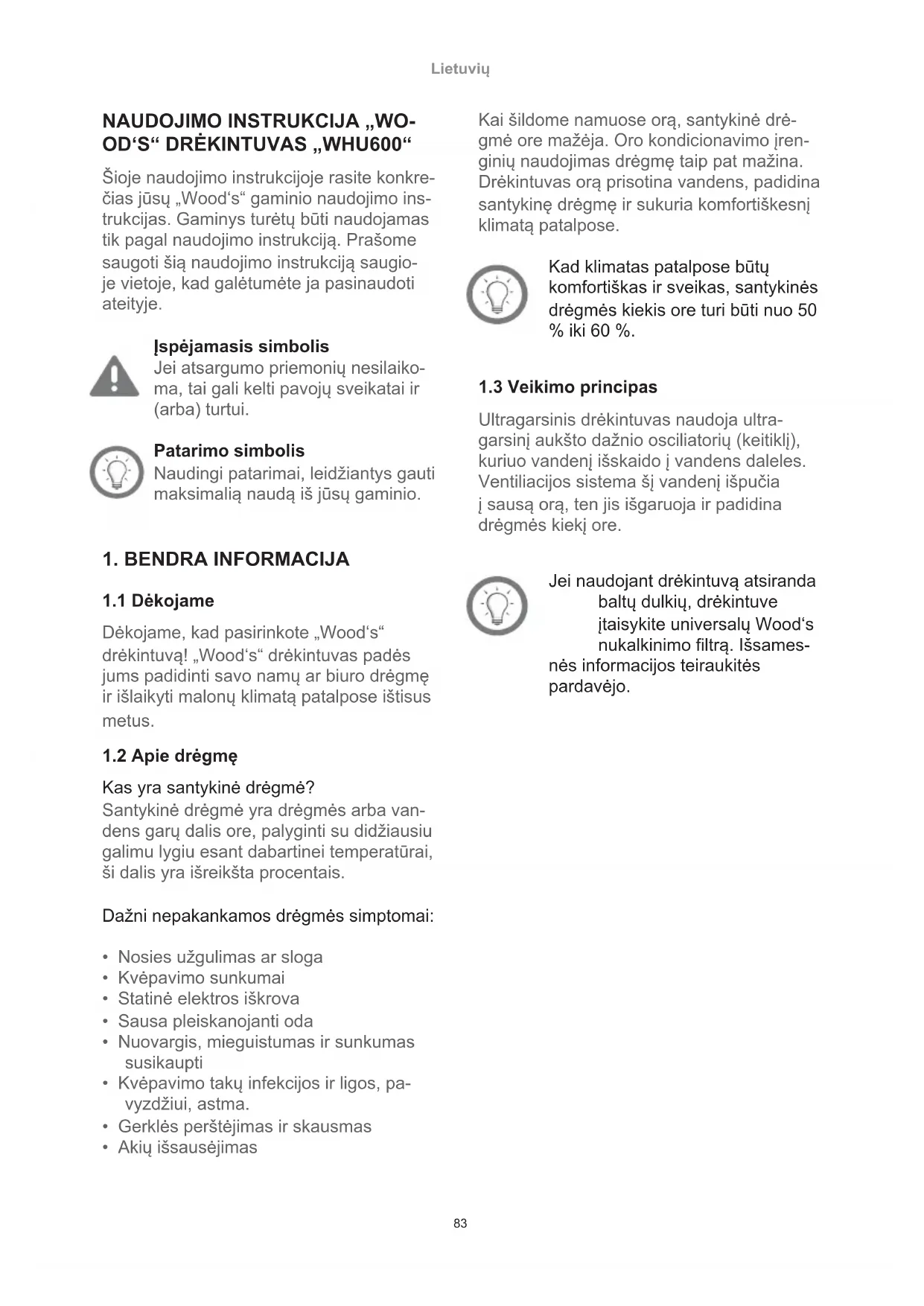 Ultragarsinis drėkintuvas naudoja ultra- garsinį aukšto dažnio osciliatorių (keitiklį), kuriuo vandenį išskaido į vandens daleles. Ventiliacijos sistema šį vandenį išpučia į sausą orą, ten jis išgaruoja ir padidina drėgmės kiekį ore. Jei naudojant drėkintuvą atsiranda baltų dulkių, drėkintuve įtaisykite universalų Wood‘s nukalkinimo ltrą. Išsames- nės informacijos teiraukitės pardavėjo. Lietuvių84