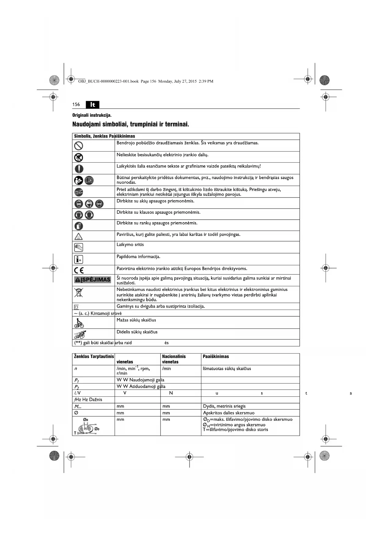 Originali instrukcija. Naudojami simboliai, trumpiniai ir terminai. Simbolis, ženklas Paaiškinimas Bendrojo pobūdžio draudžiamasis ženklas. Šis veiksmas yra draudžiamas. Nelieskite besisukančių elektrinio įrankio dalių. Laikykitės šalia esančiame tekste ar grafiniame vaizde pateiktų reikalavimų! Būtinai perskaitykite pridėtus dokumentus, pvz., naudojimo instrukciją ir bendrąsias saugos nuorodas. Prieš atlikdami šį darbo žingsnį, iš kištukinio lizdo ištraukite kištuką. Priešingu atveju, elektriniam įrankiui netikėtai įsijungus iškyla sužalojimo pavojus. Dirbkite su akių apsaugos priemonėmis. Dirbkite su klausos apsaugos priemonėmis. Dirbkite su rankų apsaugos priemonėmis. Paviršius, kurį galite paliesti, yra labai karštas ir todėl pavojingas. Laikymo sritis Papildoma informacija. Patvirtina elektrinio įrankio atitiktį Europos Bendrijos direktyvoms. Ši nuoroda įspėja apie galimą pavojingą situaciją, kuriai susidarius galima sunkiai ar mirtinai susižaloti. Nebetinkamus naudoti elektrinius įrankius bei kitus elektrinius ir elektroninius gaminius surinkite atskirai ir nugabenkite į antrinių žaliavų tvarkymo vietas perdirbti aplinkai nekenksmingu būdu. Gaminys su dviguba arba sustiprinta izoliacija. ~ (a. c.) Kintamoji srovė Mažas sūkių skaičius Didelis sūkių skaičius (**) gali būti skaičiai arba raid