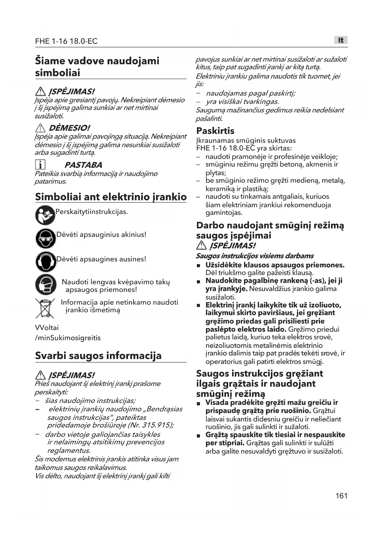 Šiame vadove naudojami simboliai ĮSPĖJIMAS! Įspėja apie gresiantį pavojų. Nekreipiant dėmesio į šį įspėjimą galima sunkiai ar net mirtinai susižaloti. DĖMESIO! Įspėja apie galimai pavojingą situaciją. Nekreipiant dėmesio į šį įspėjimą galima nesunkiai susižaloti arba sugadinti turtą. PASTABA Pateikia svarbią informaciją ir naudojimo patarimus. Simboliai ant elektrinio įrankio Perskaityti instrukcijas. Dėvėti apsauginius akinius! Dėvėti apsaugines ausines! Naudoti lengvas kvėpavimo takų apsaugos priemones! Informacija apie netinkamo naudoti įrankio išmetimą V Voltai /min Sukimosi greitis Svarbi saugos informacija ĮSPĖJIMAS! Prieš naudojant šį elektrinį įrankį prašome perskaityti: šias naudojimo instrukcijas; elektrinių įrankių naudojimo „Bendrąsias saugos instrukcijas“, pateiktas pridedamoje brošiūroje (Nr. 315.915); darbo vietoje galiojančias taisykles ir nelaimingų atsitikimų prevencijos reglamentus. Šis modernus elektrinis įrankis atitinka visus jam taikomus saugos reikalavimus. Vis dėlto, naudojant šį elektrinį įrankį gali kilti pavojus sunkiai ar net mirtinai susižaloti ar sužaloti kitus, taip pat sugadinti įrankį ar kitą turtą. Elektriniu įrankiu galima naudotis tik tuomet, jei jis: naudojamas pagal paskirtį; yra visiškai tvarkingas. Saugumą mažinančius gedimus reikia nedelsiant pašalinti. Paskirtis Įkraunamas smūginis suktuvas FHE 1-16 18.0-EC yra skirtas: