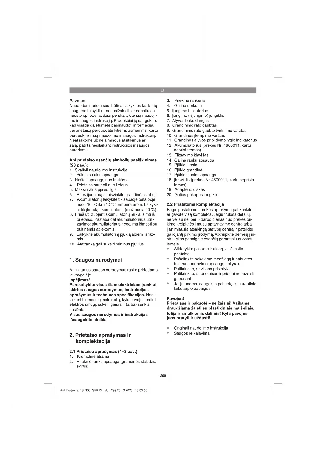 Įspėjimas! Prieš reguliuodami prietaisą, visada išimkite akumuliatorių. Anl_Fortexxa_18_300_SPK13.indb 300 23.10.2023 13:53:57LT