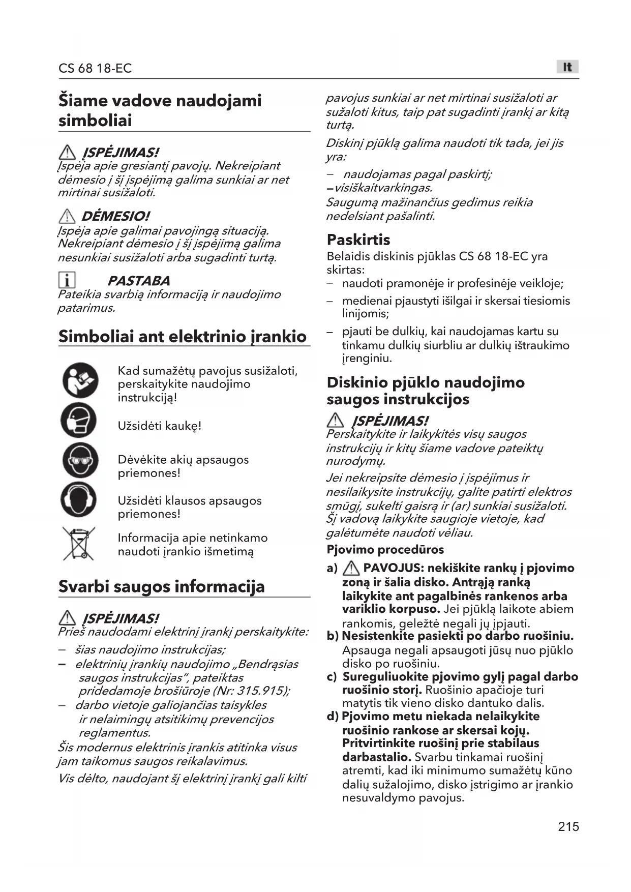 PAVOJUS: nekiškite rankų į pjovimo zoną ir šalia disko. Antrąją ranką laikykite ant pagalbinės rankenos arba variklio korpuso. Jei pjūklą laikote abiem rankomis, geležtė negali jų įpjauti.b) Nesistenkite pasiekti po darbo ruošiniu. Apsauga negali apsaugoti jūsų nuo pjūklo disko po ruošiniu.c) Sureguliuokite pjovimo gylį pagal darbo ruošinio storį. Ruošinio apačioje turi matytis tik vieno disko dantuko dalis.d) Pjovimo metu niekada nelaikykite ruošinio rankose ar skersai kojų. Pritvirtinkite ruošinį prie stabilaus darbastalio. Svarbu tinkamai ruošinį atremti, kad iki minimumo sumažėtų kūno dalių sužalojimo, disko įstrigimo ar įrankio nesuvaldymo pavojus.216 CS 68 18-EC e) Elektrinį įrankį laikykite tik už izoliuoto laikymo paviršiaus, kai pjaunate vietose, kuriose pjovimo diskas gali pažeisti paslėptą elektros laidą ar paties įrankio laidą. Pažeidus laidą, kuriuo teka elektros srovė, ji taip pat pradeda tekėti metalinėmis įrankio dalimis, ir tokiu atveju operatorius gali patirti elektros smūgį. f) Pjaudami prapjovas visada naudokite lygiagrečią pjovimo atramą arba statmeną krašto atramą. Taip pjūvis bus tikslesnis ir sumažės disko įstrigimo tikimybė. g) Visada naudokite tinkamo dydžio ir tvirtinimo prie veleno angos formos (ne apvalios, o rombo) pjovimo diskus. Jei pjovimo disko tvirtinimo anga netinka pjūklo velenui, diskas suksis ekscentriškai ir galite nesuvaldyti įrankio. h) Niekada nenaudokite pažeistų ar netinkamų disko poveržlių ar varžtų. Originalios disko poveržlės ir varžtai buvo specialiai sukurti jūsų pjūklui, siekiant optimalaus veikimo ir veikimo saugumo. Atatrankos priežastys ir susiję įspėjimai