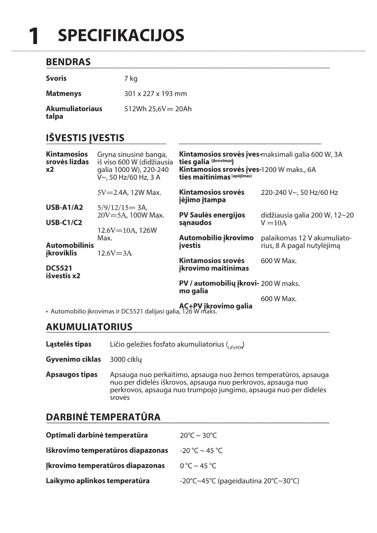 7 kg 301 x 227 x 193 mm 512Wh 25,6V⎓ 20Ah Kintamosios srovės lizdas
