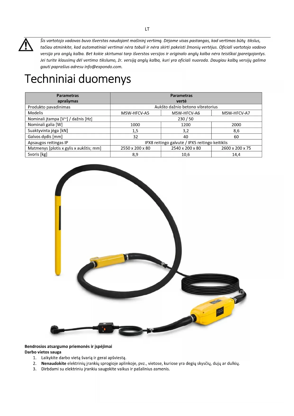 Šis vartotojo vadovas buvo išverstas naudojant mašininį vertimą. Dėjome visas pastangas, kad vertimas būtų tikslus, tačiau atminkite, kad automatiniai vertimai nėra tobuli ir nėra skirti pakeisti žmonių vertėjus. Oficiali vartotojo vadovo versija yra anglų kalba. Bet kokie skirtumai tarp išverstos versijos ir originalo anglų kalba nėra teisiškai įpareigojantys. Jei turite klausimų dėl vertimo tikslumo, žr. versiją anglų kalba, kuri yra oficiali nuoroda. Daugiau kalbų versijų galima gauti paprašius adresu info@expondo.com. Techniniai duomenys Parametras aprašymas Parametras vertė Produkto pavadinimas Aukšto dažnio betono vibratorius Modelis MSW-HFCV-A5 MSW-HFCV-A6 MSW-HFCV-A7 Nominali įtampa [V~] / dažnis [Hz] 230 / 50 Nominali galia [W]