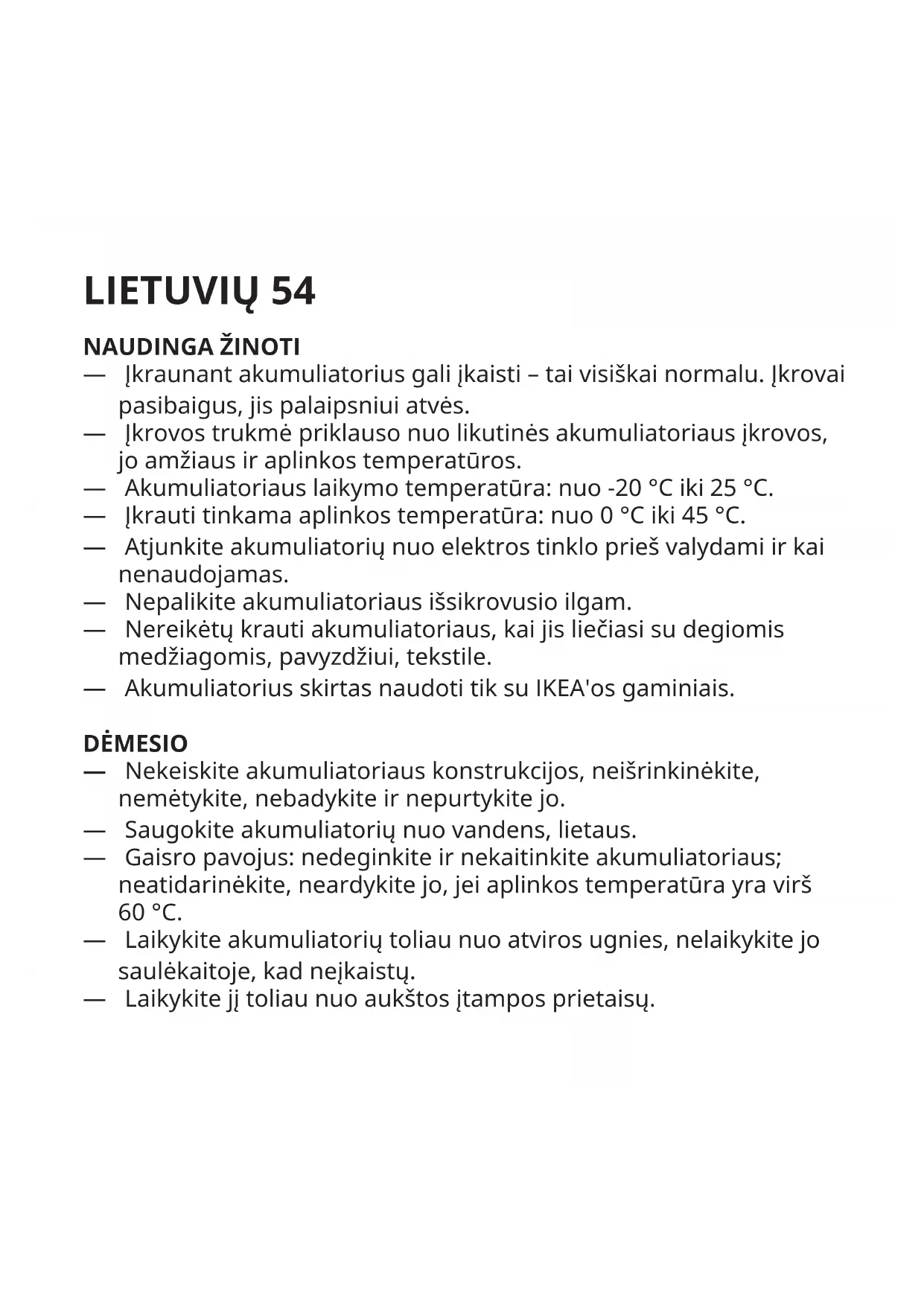Tips: ICBL7.2-18-USB-A1 Jauda: 2600mAh/18.72Wh Ieeja: DC 5V, 1.0A (Micro USB) DC 8.4V, 2.0A (4 pin connector) Izeja: DC 7.2V, 2.0A Tikai lietošanai telpās Atkārtoti uzlādējama litija jonu baterija. Šī ierīce atbilst UL STD. 2054 standartam Ražotājs: IKEA of Sweden AB Adrese: Box 702, SE-343 81 Älmhult, SWEDEN Nosvītrotais atkritumu konteinera simbols norāda, ka prece jālikvidē atsevišķi no citiem sadzīves atkritumiem. Šī prece jānodod pārstrādei, ņemot vērā vietējos vides aizsardzības noteikumus, kas attiecas uz atkritumu apsaimniekošanu. Nošķirot marķēto preci no sadzīves atkritumiem, jūs palīdzēsiet samazināt atkritumu apjomu, kas nonāk atkritumu sadedzināšanas iekārtās vai atkritumu poligonos, tādējādi samazinot to potenciālo negatīvo ietekmi uz veselību un vidi. Sīkāka informācija IKEA veikalos.LIETUVIŲ 54 NAUDINGA ŽINOTI — Įkraunant akumuliatorius gali įkaisti – tai visiškai normalu. Įkrovai pasibaigus, jis palaipsniui atvės. — Įkrovos trukmė priklauso nuo likutinės akumuliatoriaus įkrovos, jo amžiaus ir aplinkos temperatūros. — Akumuliatoriaus laikymo temperatūra: nuo -20 °C iki 25 °C. — Įkrauti tinkama aplinkos temperatūra: nuo 0 °C iki 45 °C. — Atjunkite akumuliatorių nuo elektros tinklo prieš valydami ir kai nenaudojamas. — Nepalikite akumuliatoriaus išsikrovusio ilgam. — Nereikėtų krauti akumuliatoriaus, kai jis liečiasi su degiomis medžiagomis, pavyzdžiui, tekstile. — Akumuliatorius skirtas naudoti tik su IKEA'os gaminiais. DĖMESIO — Nekeiskite akumuliatoriaus konstrukcijos, neišrinkinėkite, nemėtykite, nebadykite ir nepurtykite jo. — Saugokite akumuliatorių nuo vandens, lietaus. — Gaisro pavojus: nedeginkite ir nekaitinkite akumuliatoriaus; neatidarinėkite, neardykite jo, jei aplinkos temperatūra yra virš 60 °C. — Laikykite akumuliatorių toliau nuo atviros ugnies, nelaikykite jo saulėkaitoje, kad neįkaistų. — Laikykite jį toliau nuo aukštos įtampos prietaisų.55 — Akumuliatorius nėra žaislas – laikykite jį vaikams nepasiekiamoje vietoje. Įsitikinkite, kad prieš naudodami, kiti asmenys taip pat perskaitytų naudojimo instrukcijas ir kitą svarbią informaciją. — Nemėginkite sukelti trumpojo jungimo. — Jei teka akumuliatoriaus skystis, saugokitės, kad jo nepatektų į akis ant ant odos.