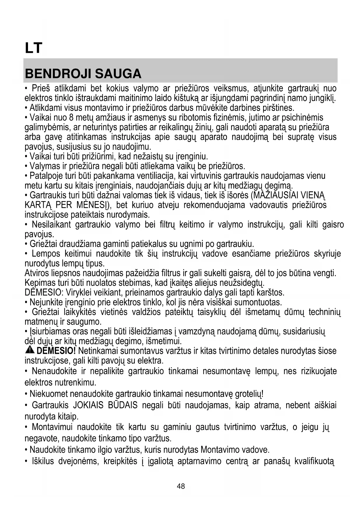 - Patalpoje turi būti pakankama ventiliacija, kai virtuvinis gartraukis naudojamas vienu metu kartu su kitais įrenginiais, naudojančiais dujų ar kitų medžiagų degimą.
