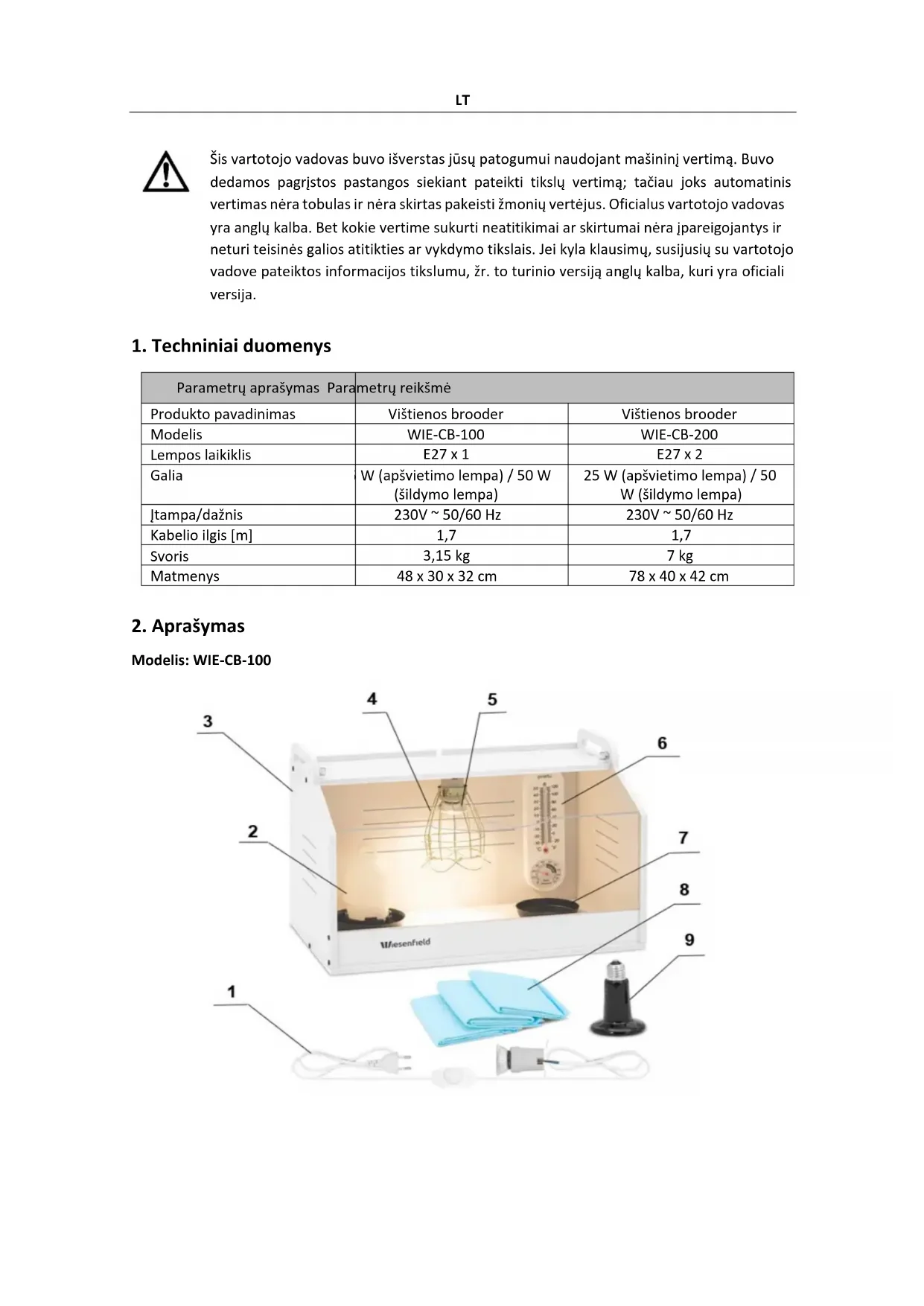 Modelis: WIE-CB-100LT 1 – maitinimo laidas 2 – rutulinio tipo paukštienos girdykla 3 – Būstas 4 – Apsauginis dangtelis 5 – Lempa su reguliatoriumi 6 – termometras 7 – Maitinimo dubuo 8 – Grindų kilimėliai 9 – Šildymo lempa su reguliatoriumi Modelis: WIE-CB-200 1 – Grindų kilimėliai 2 – rutulinio tipo paukštienos girdykla 3 – Būstas 4 – Apsauga nuo nuplikimo 5 – Šildymo lempa su reguliatoriumi 6 – termometras 7 – Lempa su reguliatoriumi 8 – Maitinimo dubuoLT