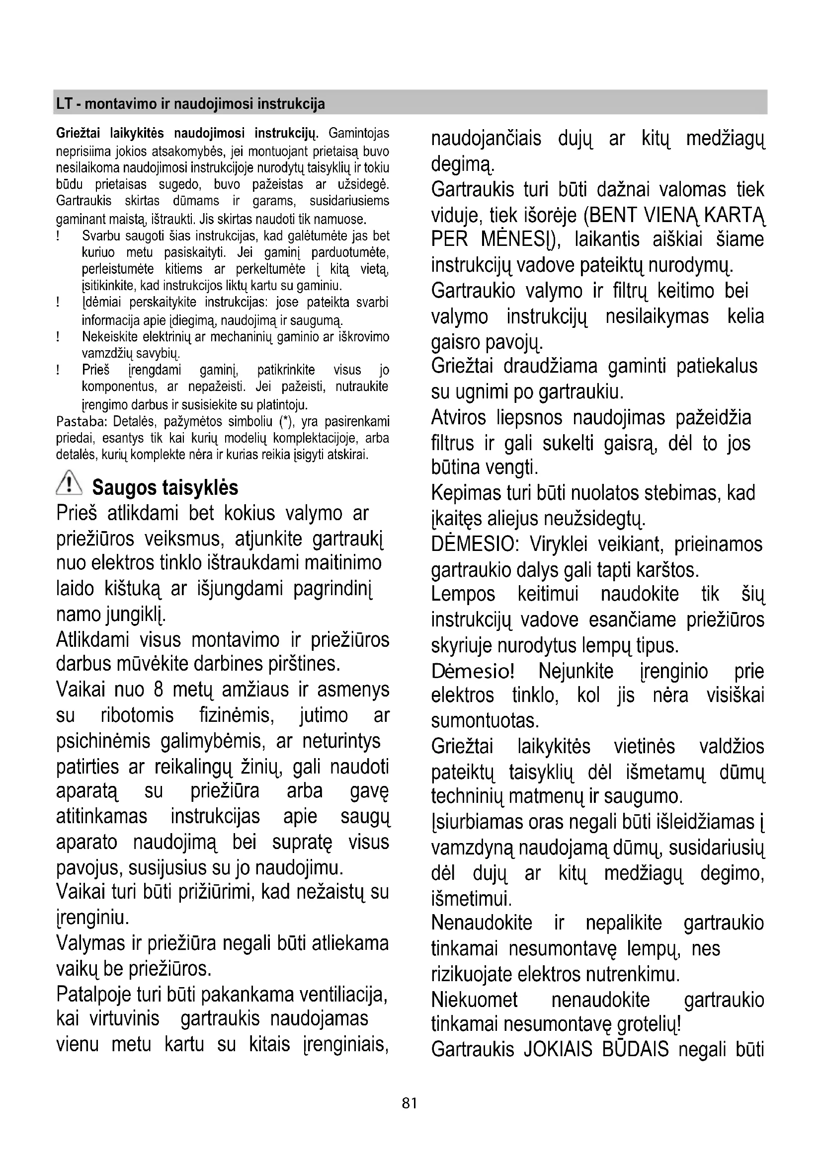 Töötamine Tulede ja tõmbemootori sisselülitamiseks kasutada õhupuhasti eesküljel olevaid lüliteid. Kui auru kontsentratsioon köögis on eriti suur, kasutage kõige suuremat kiirust. Soovitame väljatõmbe sisse lülitada 5 minutit enne söögitegemise algust ning jätta see pärast söögivalmistamise lõppu veel umbes 15 minutiks tööle. Hooldus Puhastamine Puhastamiseks kasutage AINULT neutraalse vedela puhastusvahendiga niisutatud lappi. ÄRGE KASUTAGE PUHASTAMISEKS TÖÖRIISTU VÕI VAHENDEID! Vältige abrasiivseid aineid sisaldavaid vahendeid. ÄRGE KASUTAGE PUHASTAMISEKS ALKOHOLI! Rasvafilter Püüab kinni toiduvalmistamisel tekkivad rasvaosakesed. Seda tuleb kord kuus mittesööbivate puhastusvahenditega puhastada kas käsitsi või nõudepesumasinas madala temperatuuri ja lühikese tsükliga. Nõudepesumasinas pesemisel võib metallist rasvafilter värvi muuta, aga tema filtreerimisomadusi ei muuda see vähimalgi määral. Rasvafiltri eemaldamiseks tõmmake hooba. Joonis 1 Aktiivsöefilter (ainult filtreeriva režiimi jaoks) Joonis 2 Absorbeerib toiduvalmistamisel tekkivad ebameeldivad lõhnad. Söefilter küllastub kas lühema või pikema kasutamise järel olenevalt pliidist ja sellest, kui korrapäraselt rasvafiltrit puhastatakse. Igal juhul tuleb kassett välja vahetada vähemalt iga nelja kuu tagant. Seda EI TOHI pesta ega taasaktiveerida Eemaldage rasvafiltrid. Paigaldage filtrid mootorikatte külge Kontrollige, kas ventilaatori kinnituskruvid R on avadega S kohakuti, pöörake päripäeva, kuni ta jääb pidama. Lahtivõtmiseks korrake samu toiminguid vastupidi. Pange rasvafiltrid tagasi. Pirnide vahetamine Joonis 1 Võtke aparaat vooluvõrgust välja. Tähelepanu! Enne pirnide puudutamist veenduge, kas need on jahtunud. Asendage katkine lamp sama tüüpi lambiga, nii nagu on kirjas märgisel või õhupuhastil lambi kõrval. Lambipesade juurde pääsemiseks eemaldage kate A. Kui valgustus ei hakka tööle, kontrollige enne tehnoabi kutsumist, kas pirn on korralikult pesas.81 LT - montavimo ir naudojimosi instrukcija Griežtai laikykitės naudojimosi instrukcijų. Gamintojas neprisiima jokios atsakomybės, jei montuojant prietaisą buvo nesilaikoma naudojimosi instrukcijoje nurodytų taisyklių ir tokiu būdu prietaisas sugedo, buvo pažeistas ar užsidegė. Gartraukis skirtas dūmams ir garams, susidariusiems gaminant maistą, ištraukti. Jis skirtas naudoti tik namuose. ! Svarbu saugoti šias instrukcijas, kad galėtumėte jas bet kuriuo metu pasiskaityti. Jei gaminį parduotumėte, perleistumėte kitiems ar perkeltumėte į kitą vietą, įsitikinkite, kad instrukcijos liktų kartu su gaminiu. ! Įdėmiai perskaitykite instrukcijas: jose pa teikta svarbi informacija apie įdiegimą, naudojimą ir saugumą. ! Nekeiskite elektrinių ar mechaninių gaminio ar iškrovimo vamzdžių savybių. ! Prieš įrengdami gaminį, patikrinkite visus jo komponentus, ar nepažeisti. Jei pažeisti, nutraukite įrengimo darbus ir susisiekite su platintoju. Pastaba: Detalės, pažymėtos simboliu (*), yra pasirenkami priedai, esantys tik kai kurių modelių komplektacijoje, arba detalės, kuri ų komplekte nėra ir kurias reikia įsigyti atskirai. Saugos taisyklės Prieš atlikdami bet kokius valymo ar priežiūros veiksmus, atjunkite gartraukį nuo elektros tinklo ištraukdami maitinimo laido kištuką ar išjungdami pagrindinį namo jungiklį. Atlikdami visus montavimo ir priežiūros darbus mūvėkite darbines pirštines. Vaikai nuo 8 metų amžiaus ir asmenys su ribotomis fizinėmis, jutimo ar psichinėmis galimybėmis, ar neturintys patirties ar reikalingų žinių, gali naudoti aparatą su priežiūra arba gavę atitinkamas instrukcijas apie saugų aparato naudojimą bei supratę visus pavojus, susijusius su jo naudojimu. Vaikai turi būti prižiūrimi, kad nežaistų su įrenginiu. Valymas ir priežiūra negali būti atliekama vaikų be priežiūros. Patalpoje turi būti pakankama ventiliacija, kai virtuvinis gartraukis naudojamas vienu metu kartu su kitais įrenginiais, naudojančiais dujų ar kitų medžiagų degimą. Gartraukis turi būti dažnai valomas tiek viduje, tiek išorėje (BENT VIENĄ KARTĄ PER MĖNESĮ), laikantis aiškiai šiame instrukcijų vadove pateiktų nurodymų. Gartraukio valymo ir filtrų keitimo bei valymo instrukcijų nesilaikymas kelia gaisro pavojų. Griežtai draudžiama gaminti patiekalus su ugnimi po gartraukiu. Atviros liepsnos naudojimas pažeidžia filtrus ir gali sukelti gaisrą, dėl to jos būtina vengti. Kepimas turi būti nuolatos stebimas, kad įkaitęs aliejus neužsidegtų. DĖMESIO: Viryklei veikiant, prieinamos gartraukio dalys gali tapti karštos. Lempos keitimui naudokite tik šių instrukcijų vadove esančiame priežiūros skyriuje nurodytus lempų tipus. Dėmesio! Nejunkite įrenginio prie elektros tinklo, kol jis nėra visiškai sumontuotas. Griežtai laikykitės vietinės valdžios pateiktų taisyklių dėl išmetamų dūmų techninių matmenų ir saugumo. Įsiurbiamas oras negali būti išleidžiamas į vamzdyną naudojamą dūmų, susidariusių dėl dujų ar kitų medžiagų degimo, išmetimui. Nenaudokite ir nepalikite gartraukio tinkamai nesumontavę lempų, nes rizikuojate elektros nutrenkimu. Niekuomet nenaudokite gartraukio tinkamai nesumontavę grotelių! Gartraukis JOKIAIS BŪDAIS negali būti82 naudojamas, kaip atrama, nebent aiškiai nurodyta kitaip. Montavimui naudokite tik kartu su gaminiu gautus tvirtinimo varžtus, o jeigu jų negavote, naudokite tinkamo tipo varžtus. Naudokite tinkamo ilgio varžtus, kuris nurodytas Montavimo vadove. Iškilus dvejonėms, kreipkitės į įgaliotą aptarnavimo centrą ar panašų kvalifikuotą personalą. DĖMESIO! Netinkamai sumontavus varžtus ir kitas tvirtinimo detales nurodytas šiose instrukcijose, gali kilti pavojų su elektra. Gamintojas neprisiima jokios atsakomybės dėl nepatogumų, žalos ar nelaimingų atsitikimų įvykstančių dėl šiame instrukcijų vadove patei