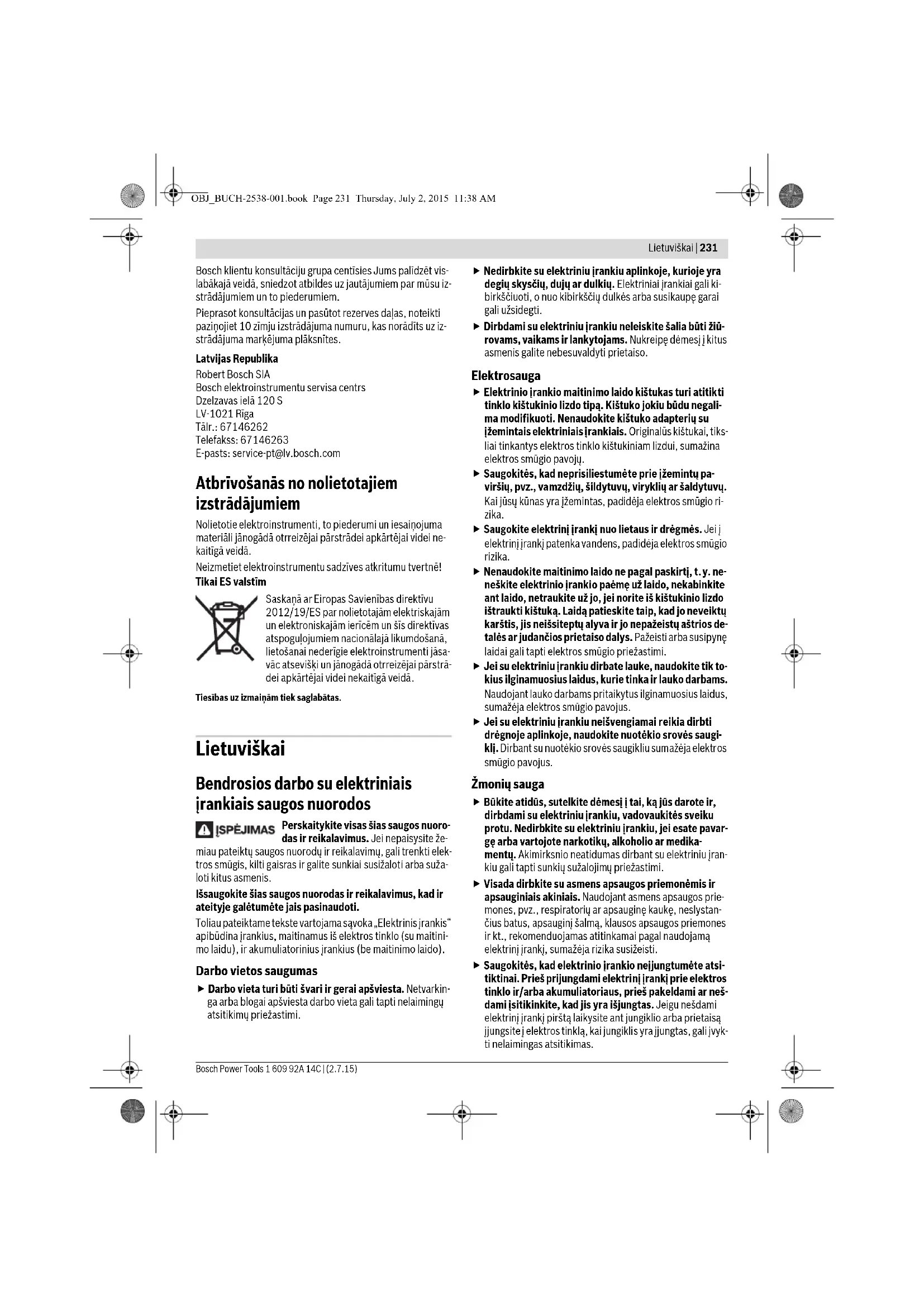 Veiksmas Pav. Atkreipkite dėmesį Puslapis OBJ_BUCH-2538-001.book Page 237 Thursday, July 2, 2015 11:38 AM238 | 한국어 1 609 92A 14C | (2.7.15) Bosch Power Tools Priežiūra ir valymas Reguliariai valykite elektrinį įrankį ir ventiliacines angas jo korpuse, tuomet galėsite dirbti kokybiškai ir saugiai. Esant ekstremalioms darbo sąlygoms, jei yra galimybė, vi- sada naudokite nusiurbimo įrenginį. Ventiliacines angas dažnai prapūskite ir prijunkite nuotėkio srovės apsauginį išjungiklį (PRCD). Apdorojant metalus elektrinio įrankio vi- duje gali nusėsti laidžios dulkės. Gali būti pažeidžiama elektri- nio įrankio apsauginė izoliacija. Papildomą įrangą tinkamai sandėliuokite ir rūpestingai prižiū- rėkite. Jei reikia pakeisti maitinimo laidą, dėl saugumo sumetimų tai turi būti atliekama Bosch įmonėje arba įgaliotose Bosch elek- trinių įrankių remonto dirbtuvėse. Klientų aptarnavimo skyrius ir naudotojų konsultavimo tarnyba Klientų aptarnavimo skyriuje gausite atsakymus į klausimus, susijusius su jūsų gaminio remontu, technine priežiūra bei at- sarginėmis dalimis. Detalius brėžinius ir informaciją apie at- sargines dalis rasite čia: www.bosch-pt.com Bosch naudotojų konsultavimo tarnybos specialistai mielai at- sakys į klausimus apie mūsų gaminius ir papildomą įrangą. Ieškant informacijos ir užsakant atsargines dalis prašome bū- tinai nurodyti dešimtženklį gaminio numerį, esantį firminėje lentelėje. Lietuva Bosch įrankių servisas Informacijos tarnyba: (037) 713350 ļrankių remontas: (037) 713352 Faksas: (037) 713354 El. paštas: service-pt@lv.bosch.com Šalinimas Elektrinis įrankis, papildoma įranga ir pakuotė yra pagaminti iš medžiagų, tinkančių antriniam perdirbimui, ir vėliau privalo būti atitinkamai perdirbti. Nemeskite elektrinių įrankių į buitinių atliekų konteinerius! Tik ES šalims: Pagal Europos direktyvą 2012/19/ES dėl elektros ir elektroninės įrangos atliekų ir šios direktyvos perkėlimo į nacionalinę teisę ak- tus, naudoti nebetinkami elektriniai įrankiai turi būti surenkami atskirai ir perdirbami aplinkai nekenksmingu būdu. Galimi pakeitimai.