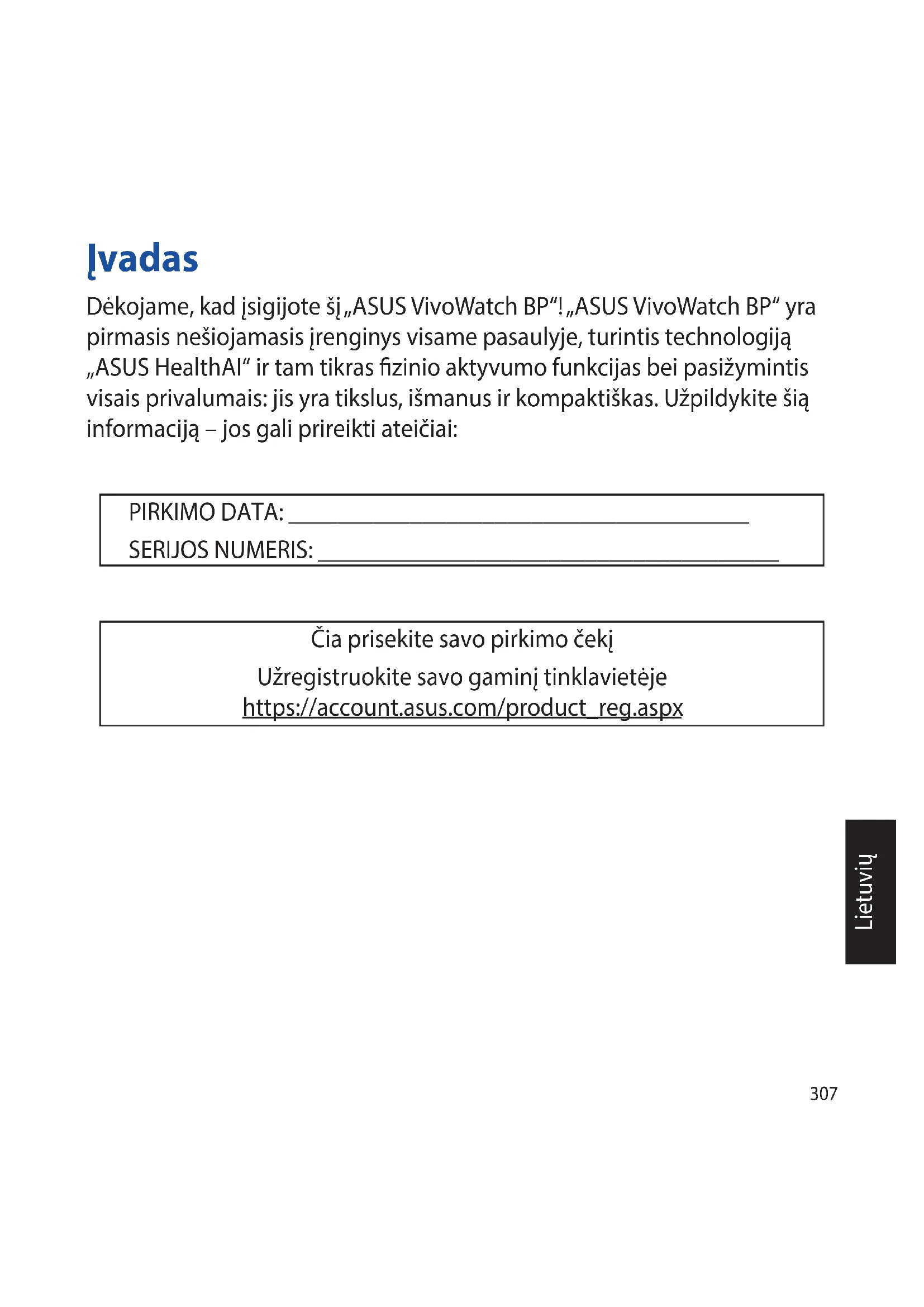 uuendamine on lõppenud, ilmub ekraanile vastav sõnum.307 Lietuvių Įvadas Dėkojame, kad įsigijote šį „ASUS VivoWatch BP“! „ASUS VivoWatch BP“ yra pirmasis nešiojamasis įrenginys visame pasaulyje, turintis technologiją „ASUS HealthAI“ ir tam tikras zinio aktyvumo funkcijas bei pasižymintis visais privalumais: jis yra tikslus, išmanus ir kompaktiškas. Užpildykite šią informaciją – jos gali prireikti ateičiai: PIRKIMO DATA: ______________________________________ SERIJOS NUMERIS: ______________________________________ Čia prisekite savo pirkimo čekį Užregistruokite savo gaminį tinklavietėje https://account.asus.com/product_reg.aspx308 Lietuvių Apie šią naudojimo instrukciją Šioje naudojimo instrukcijoje pateikiama informacija apie „ASUS VivoWatch BP“ aparatinę įrangą ir programinės įrangos savybes suskirstyta į šiuos skyrius: 1 skyrius: Nuo ko pradėti Šiame skyriuje išvardyti aparatiniai įrenginio „ASUS VivoWatch BP“ komponentai ir parodyta, kaip naudoti įvairias „ASUS VivoWatch BP“ dalis. 2 skyrius: „ASUS VivoWatch BP“ naudojimas Šiame skyriuje pateikiama „ASUS VivoWatch BP“ panaudojimo galimybių apžvalga. Priedas Šiame skyriuje pateiktos pastabos taikytinos šiam „ASUS VivoWatch BP“. Prieš pradėdami naudotis šiuo įrenginiu, perskaitykite visą naudojimo instrukcijoje pateiktą informaciją ir bet kokią kitą dėžutėje esančią literatūrą. Visą šio „ASUS VivoWatch BP“ naudojimo instrukcijos versiją rasite daugiakalbėje interneto svetainėje: https://www.asus.com/VivoWatch/VivoWatch-BP- HC-A04/HelpDesk_Manual/.309 Lietuvių Šiame vadove naudotos konvencijos Siekiant pabrėžti pagrindinę šiame vadove išdėstytą informaciją, tam tikras tekstas pateiktas taip: Šiame pranešime pateikiama gyvybiškai svarbi informacija, kuria privaloma vadovautis norint atlikti užduotį. Šiame pranešime pateikiama papildoma informacija ir patarimai, kurie gali padėti norint atlikti užduotis. Šiame pranešime pateikiama svarbi informacija, kuria privaloma vadovautis, kad būtumėte saugūs, atlikdami užduotis, ir apsaugoti nuo pažeidimo „ASUS VivoWatch BP“ duomenis bei komponentus. Tipograja Paryškintasis šriftas = Jis reiškia meniu arba elementą, kurį privaloma pasirinkti. Pasvirasis šriftas = Jis reiškia šios naudojimo instrukcijos skyrius, kuriuose galite rasti reikiamos informacijos.310 Lietuvių Atsargumo priemonės