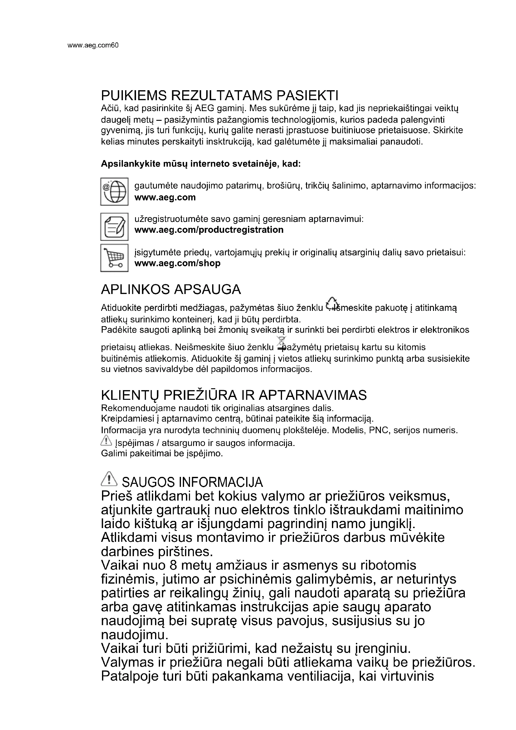 Ačiū, kad pasirinkite šį AEG gaminį. Mes sukūrėme jį taip, kad jis nepriekaištingai veiktų daugelį metų – pasižymintis pažangiomis technologijomis, kurios padeda palengvinti gyvenimą, jis turi funkcijų, kurių galite nerasti įprastuose buitiniuose prietaisuose. Skirkite kelias minutes perskaityti insktrukciją, kad galėtumėte jį maksimaliai panaudoti. Apsilankykite mūsų interneto svetainėje, kad: gautumėte naudojimo patarimų, brošiūrų, trikčių šalinimo, aptarnavimo informacijos: www.aeg.com užregistruotumėte savo gaminį geresniam aptarnavimui: www.aeg.com/productregistration įsigytumėte priedų, vartojamųjų prekių ir originalių atsarginių dalių savo prietaisui: www.aeg.com/shop APLINKOS APSAUGA Atiduokite perdirbti medžiagas, pažymėtas šiuo ženklu . Išmeskite pakuotę į atitinkamą atliekų surinkimo konteinerį, kad ji būtų perdirbta. Padėkite saugoti aplinką bei žmonių sveikatą ir surinkti bei perdirbti elektros ir elektronikos prietaisų atliekas. Neišmeskite šiuo ženklu pažymėtų prietaisų kartu su kitomis buitinėmis atliekomis. Atiduokite šį gaminį į vietos atliekų surinkimo punktą arba susisiekite su vietnos savivaldybe dėl papildomos informacijos.