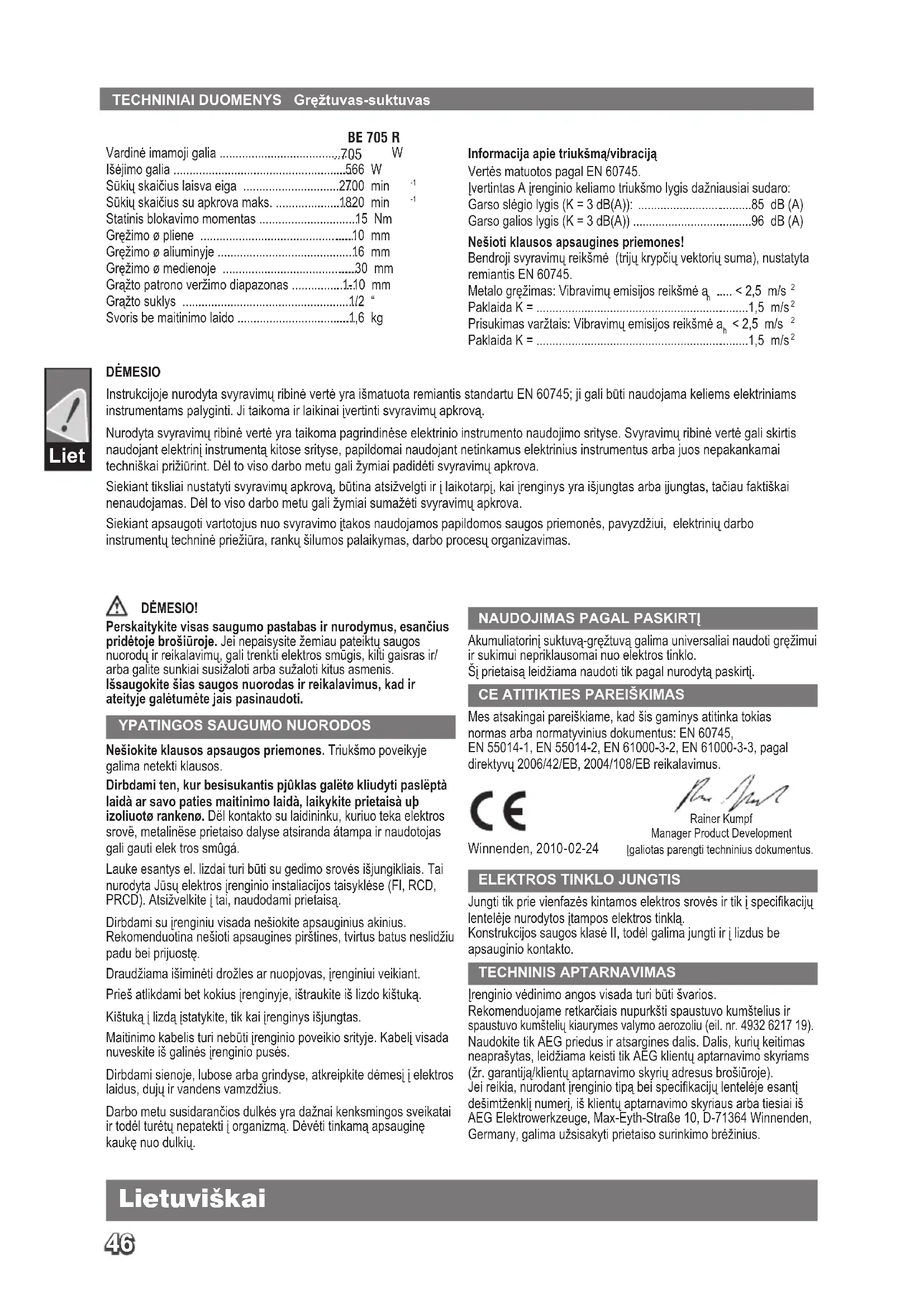 Jungti tik prie vienfazės kintamos elektros srovės ir tik į specikacijų lentelėje nurodytos įtampos elektros tinklą. Konstrukcijos saugos klasė II, todėl galima jungti ir į lizdus be apsauginio kontakto. TECHNINIS APTARNAVIMAS Įrenginio vėdinimo angos visada turi būti švarios. Rekomenduojame retkarčiais nupurkšti spaustuvo kumštelius ir spaustuvo kumštelių kiaurymes valymo aerozoliu (eil. nr. 4932 6217 19). Naudokite tik AEG priedus ir atsargines dalis. Dalis, kurių keitimas neaprašytas, leidžiama keisti tik AEG klientų aptarnavimo skyriams (žr. garantiją/klientų aptarnavimo skyrių adresus brošiūroje). Jei reikia, nurodant įrenginio tipą bei specikacijų lentelėje esantį dešimtženklį numerį, iš klientų aptarnavimo skyriaus arba tiesiai iš AEG Elektrowerkzeuge, Max-Eyth-Straße 10, D-71364 Winnenden, Germany, galima užsisakyti prietaiso surinkimo brėžinius. Rainer Kumpf Manager Product Development Įgaliotas parengti techninius dokumentus. Winnenden, 2010-02-24 Litauisch47 SIMBOLIAI Prieš pradėdami dirbti su prietaisu, atidžiai perskaitykite jo naudojimo instrukciją. Prieš atlikdami bet kokius įrenginyje, ištraukite iš lizdo kištuką. Priedas – neįeina į tiekimo komplektaciją, rekomenduojamas papildymas iš priedų asortimento. Neišmeskite elektros irengimu i buitinius šiukšlynus! Pagal ES Direktyva 2002/96/ EB del naudotu irengimu, elektros irengimu ir ju itraukimo i valstybinius istatymus naudotus irengimus butina suringti atskirai ir nugabenti antriniu žaliavu perdirbimui aplinkai nekenksmingu budu. Liet Lietuviškai48 Eest Eesti TEHNILISED ANDMED Kruvikeeraja