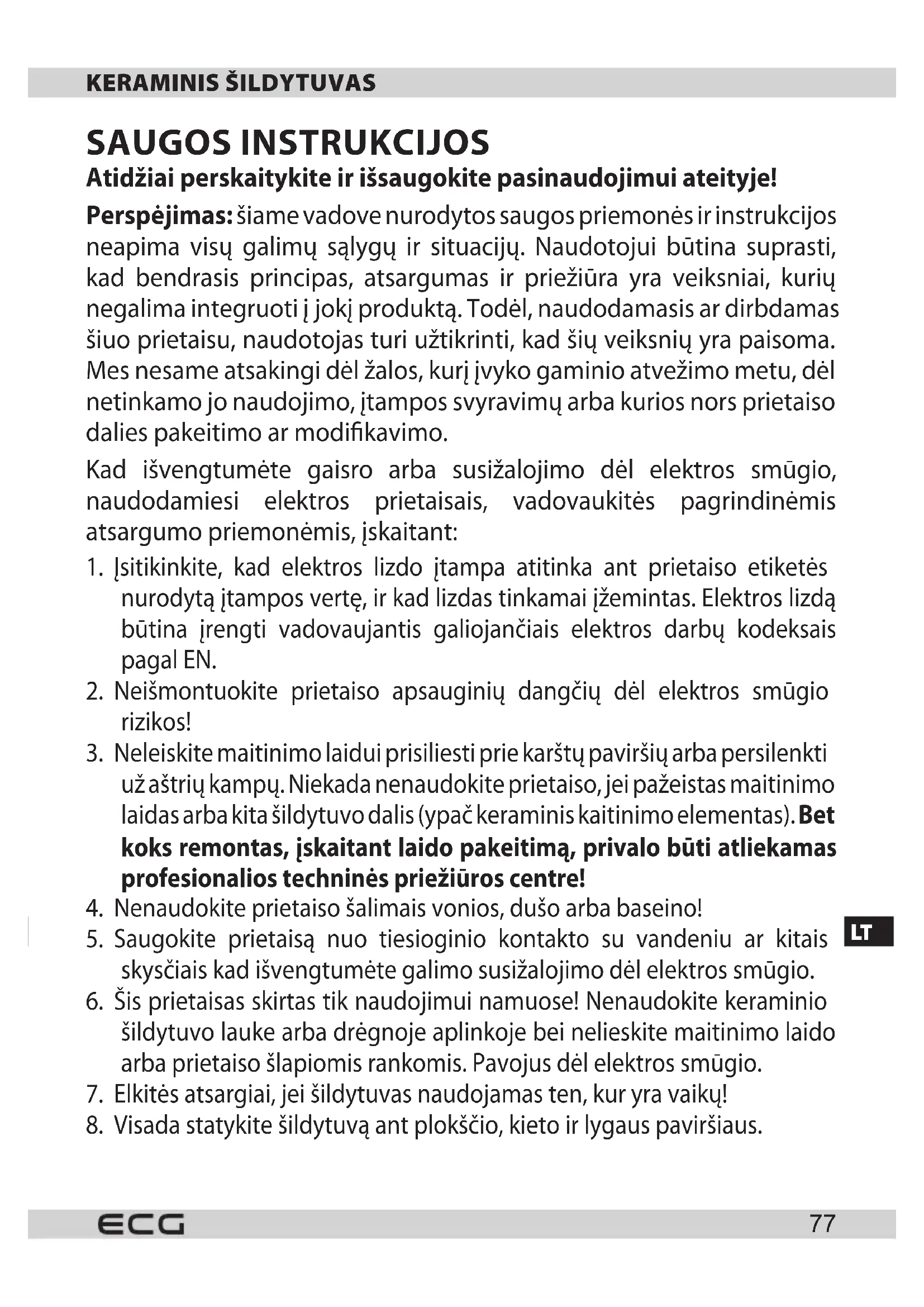 - Šis prietaisas skirtas tik naudiojimui namuose! Nenaudokite keraminio šildytuvo lauke arba dregnoje aplinkoje bei nelieskite maitinimo laido arba prietaiso šlapiomis rankomis. Pavojus del elektros smugio.