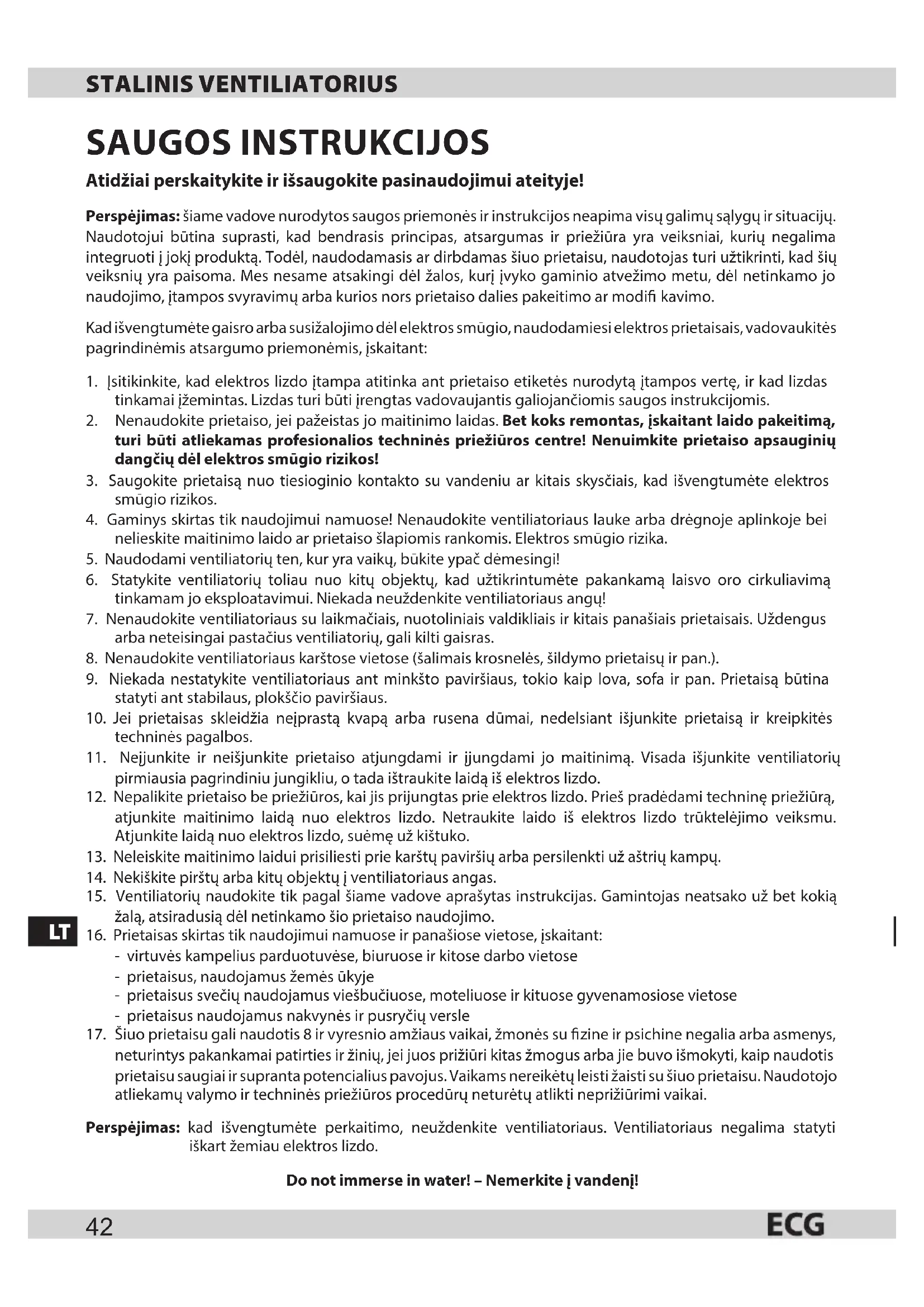 neturintys pakankamai patirties ir žinių, jei juos prižiūri kitas žmogus arba jie buvo išmokyti, kaip naudotis prietaisu saugiai ir supranta potencialius pavojus. Vaikams nereikėtų leisti žaisti su šiuo prietaisu. Naudotojo atliekamų valymo ir techninės priežiūros procedūrų neturėtų atlikti neprižiūrimi vaikai. Perspėjimas: kad išvengtumėte perkaitimo, neuždenkite ventiliatoriaus. Ventiliatoriaus negalima statyti iškart žemiau elektros lizdo. Do not immerse in water! – Nemerkite įvandenį!LT