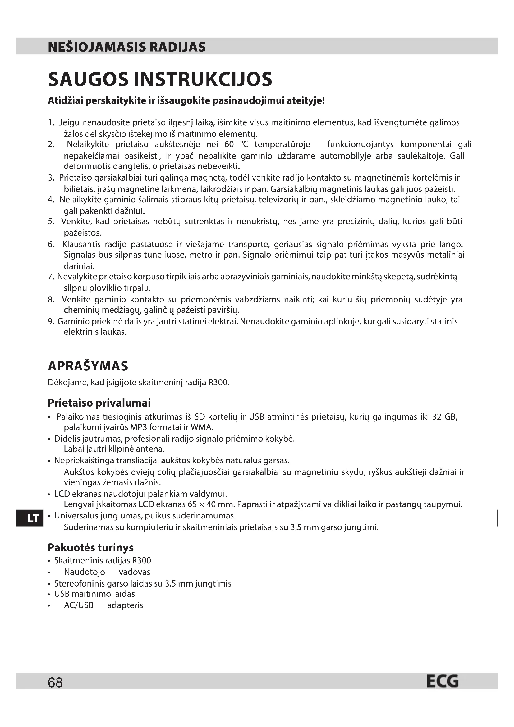 SAUGOS INSTRUKCIJOS Atidžiai perskaitykite ir išsaugokite pasinaudojimui ateityje! 1. Jeigu nenaudosite prietaiso ilgesnį laiką, išimkite visus maitinimo elementus, kad išvengtumėte galimos žalos dėl skysčio ištekėjimo iš maitinimo elementų.2. Nelaikykite prietaiso aukštesnėje nei 60 °C temperatūroje – funkcionuojantys komponentai gali nepakeičiamai pasikeisti, ir ypač nepalikite gaminio uždarame automobilyje arba saulėkaitoje. Gali deformuotis dangtelis, oprietaisas nebeveikti.3. Prietaiso garsiakalbiai turi galingą magnetą, todėl venkite radijo kontakto su magnetinėmis kortelėmis ir bilietais, įrašų magnetine laikmena, laikrodžiais ir pan. Garsiakalbių magnetinis laukas gali juos pažeisti.4. Nelaikykite gaminio šalimais stipraus kitų prietaisų, televizorių ir pan., skleidžiamo magnetinio lauko, tai gali pakenkti dažniui.5. Venkite, kad prietaisas nebūtų sutrenktas ir nenukristų, nes jame yra precizinių dalių, kurios gali būti pažeistos.6. Klausantis radijo pastatuose ir viešajame transporte, geriausias signalo priėmimas vyksta prie lango. Signalas bus silpnas tuneliuose, metro ir pan. Signalo priėmimui taip pat turi įtakos masyvūs metaliniai dariniai.7. Nevalykite prietaiso korpuso tirpikliais arba abrazyviniais gaminiais, naudokite minkštą skepetą, sudrėkintą silpnu ploviklio tirpalu.8. Venkite gaminio kontakto su priemonėmis vabzdžiams naikinti; kai kurių šių priemonių sudėtyje yra cheminių medžiagų, galinčių pažeisti paviršių.9. Gaminio priekinė dalis yra jautri statinei elektrai. Nenaudokite gaminio aplinkoje, kur gali susidaryti statinis elektrinis laukas. APRAŠYMAS Dėkojame, kad įsigijote skaitmeninį radiją R300. Prietaiso privalumai