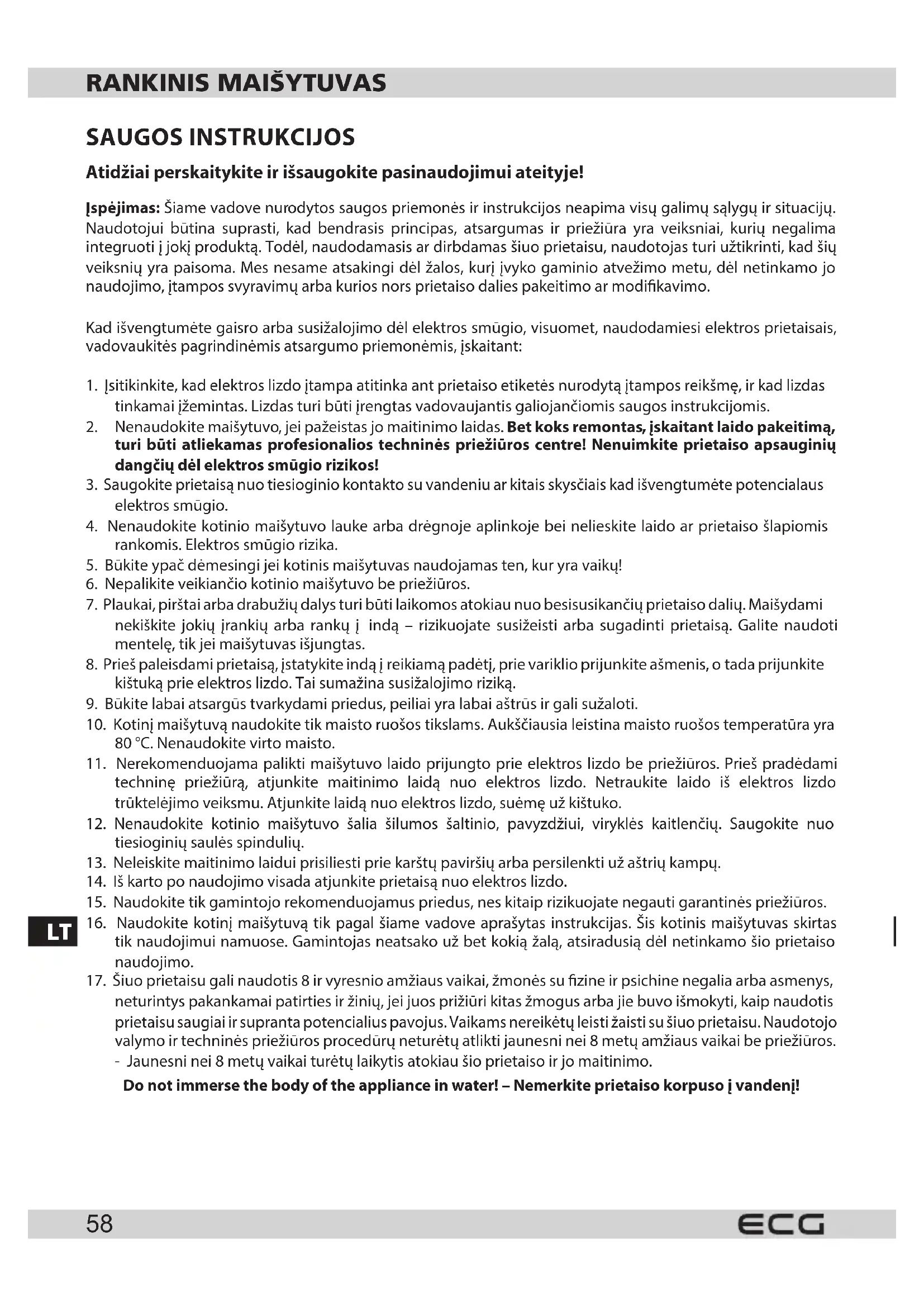 neturintys pakankamai patirties ir žinių, jei juos prižiūri kitas žmogus arba jie buvo išmokyti, kaip naudotis prietaisu saugiai ir supranta potencialius pavojus. Vaikams nereikėtų leisti žaisti su šiuo prietaisu. Naudotojo valymo ir techninės priežiūros procedūrų neturėtų atlikti jaunesni nei 8 metų amžiaus vaikai be priežiūros. - Jaunesni nei 8 metų vaikai turėtų laikytis atokiau šio prietaiso ir jo maitinimo. Do not immerse the body of the appliance in water! – Nemerkite prietaiso korpuso įvandenį!LT